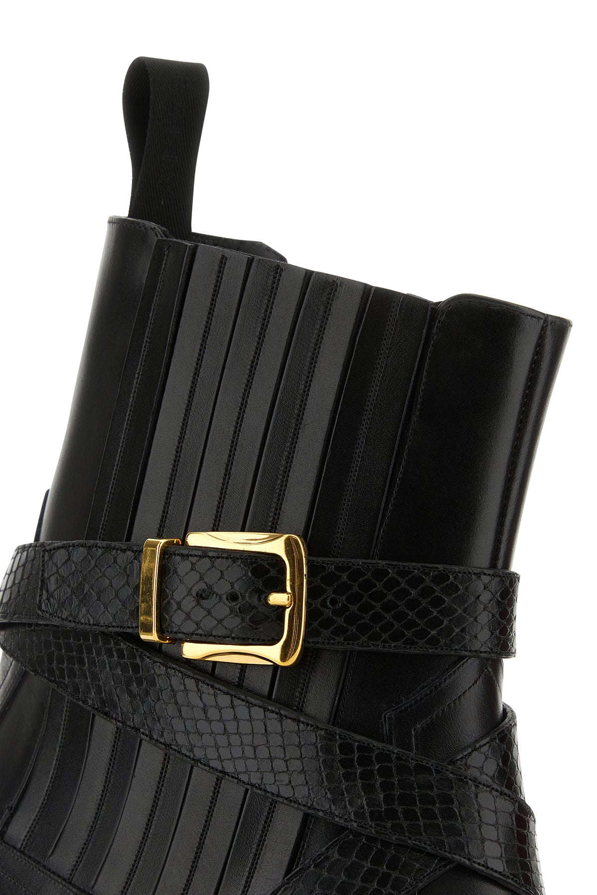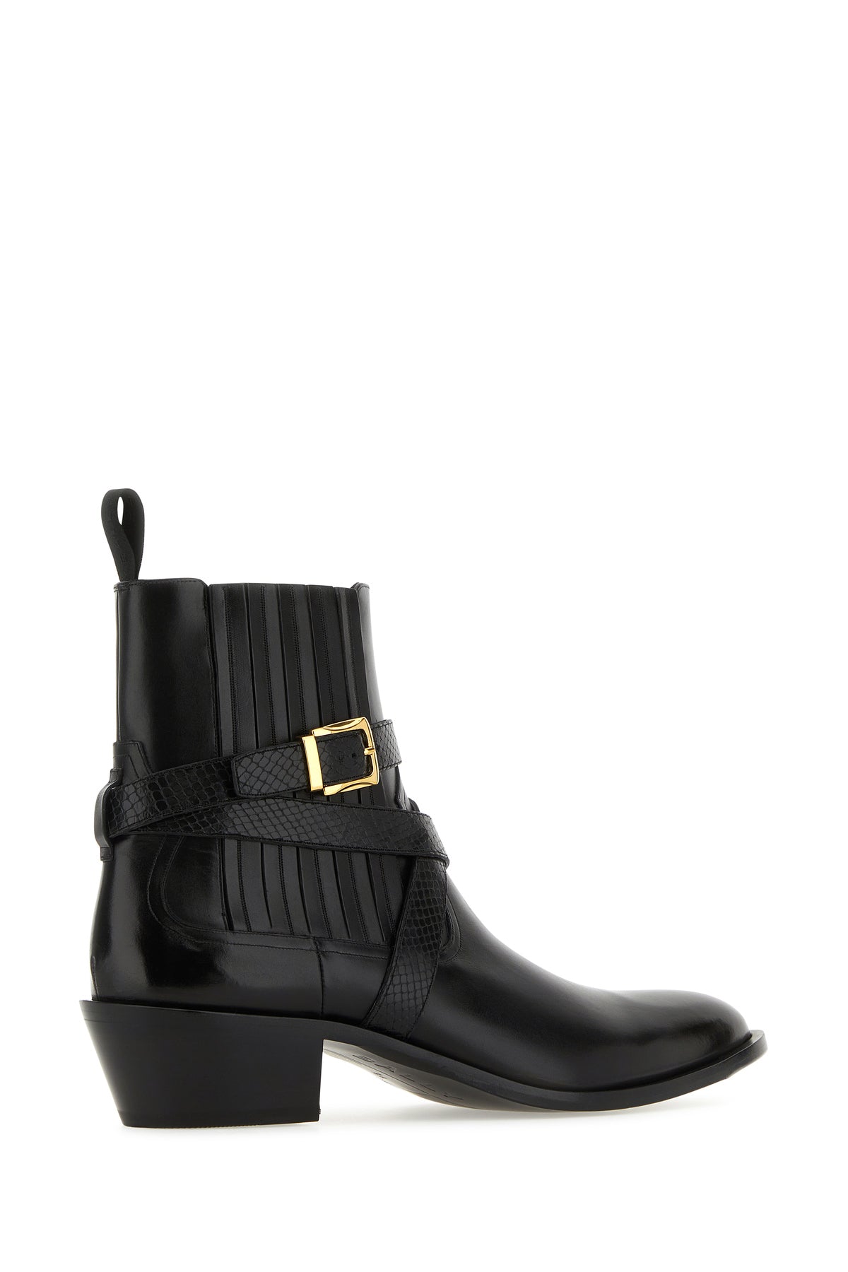 Ankle boots realized in smooth leather from a polished finish characterized by tonal fabric pull-tab.