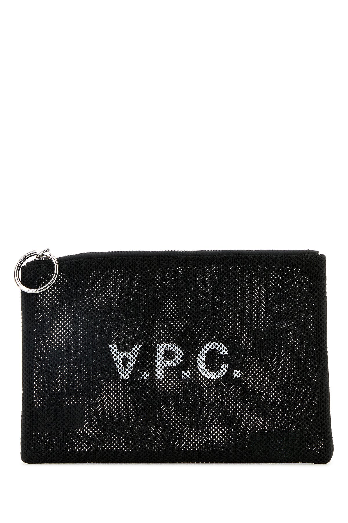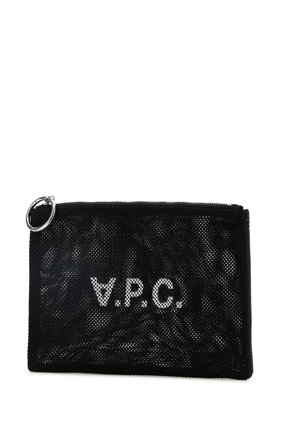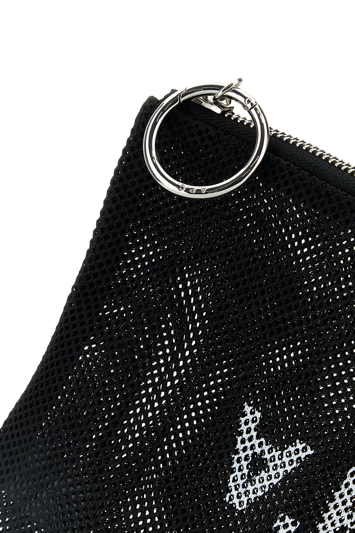 Pouch realized in mesh characterized by contrasting logoed print at the front.