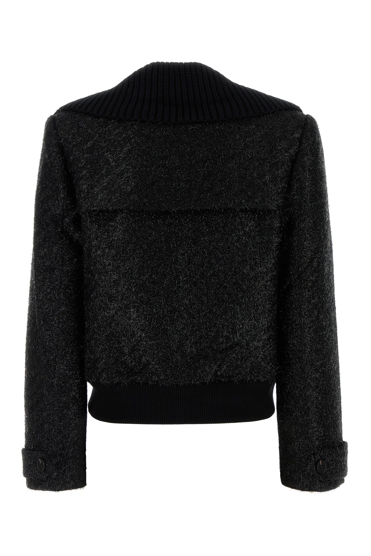 Bomber jacket realized in polyester blend with lurex threads characterized by maxi collar.
