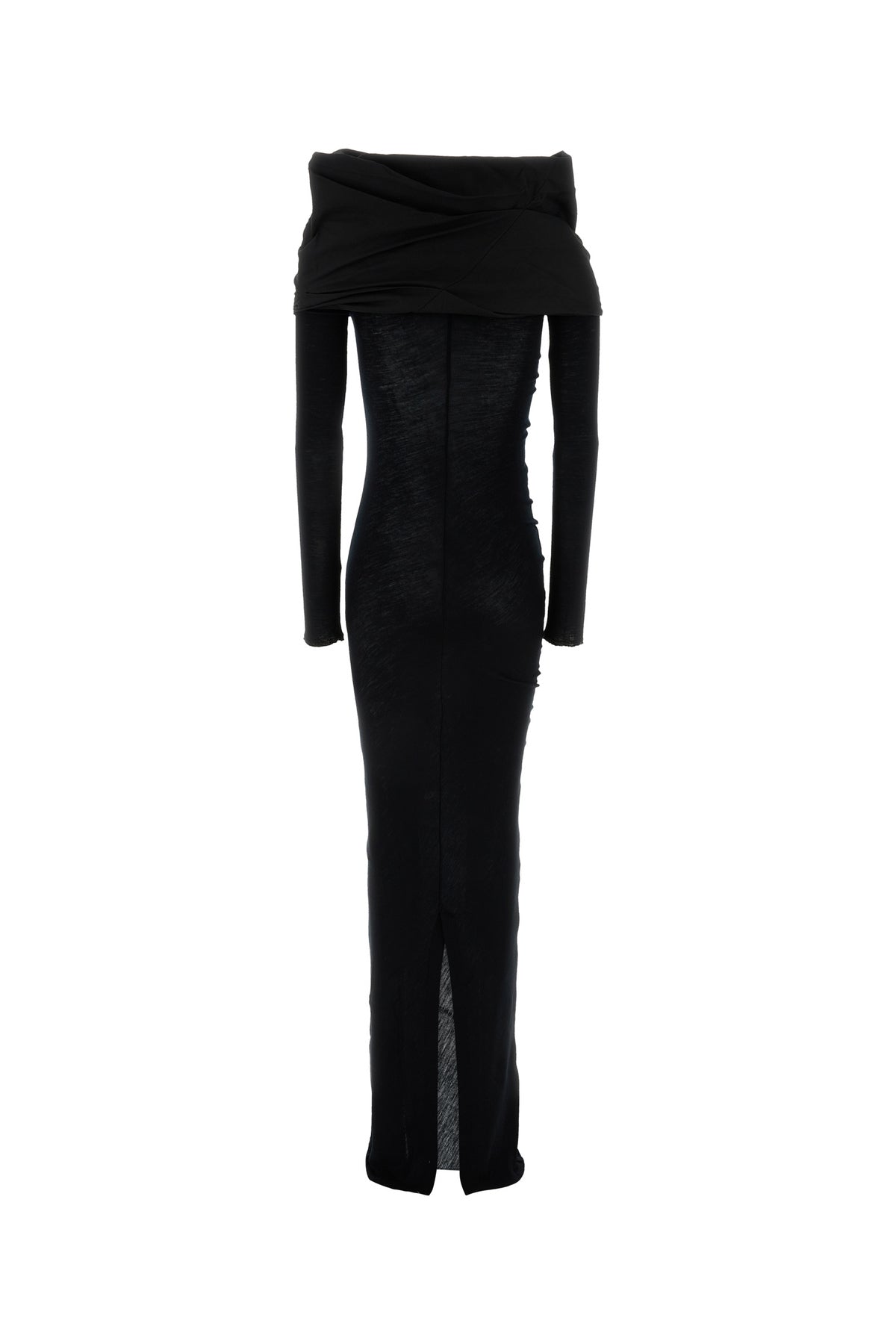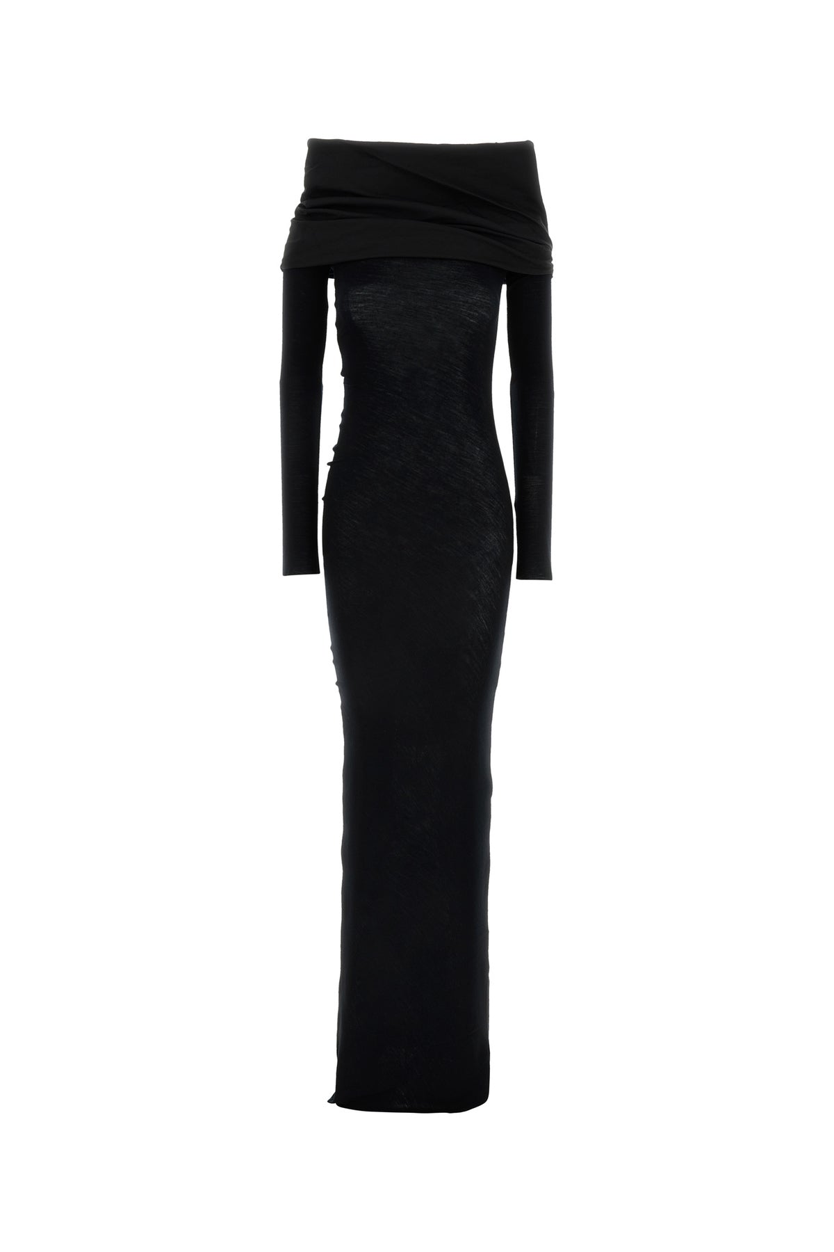 Off-the-shoulder long dress realized in pure wool.