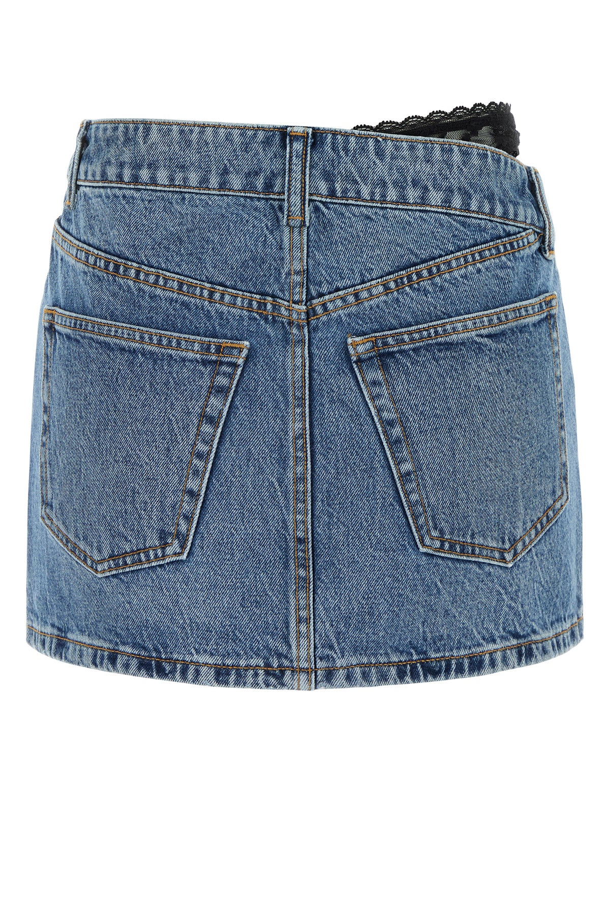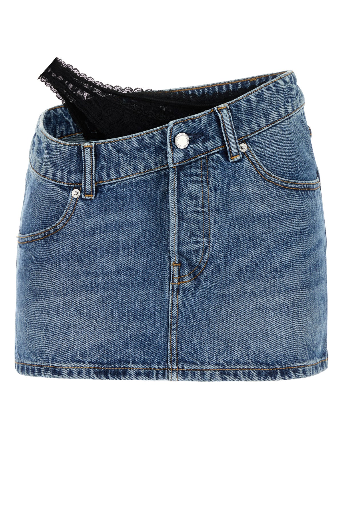 Mini skirt realized in slightly stonewashed pure cotton denim with tonal lace insert at the waist.