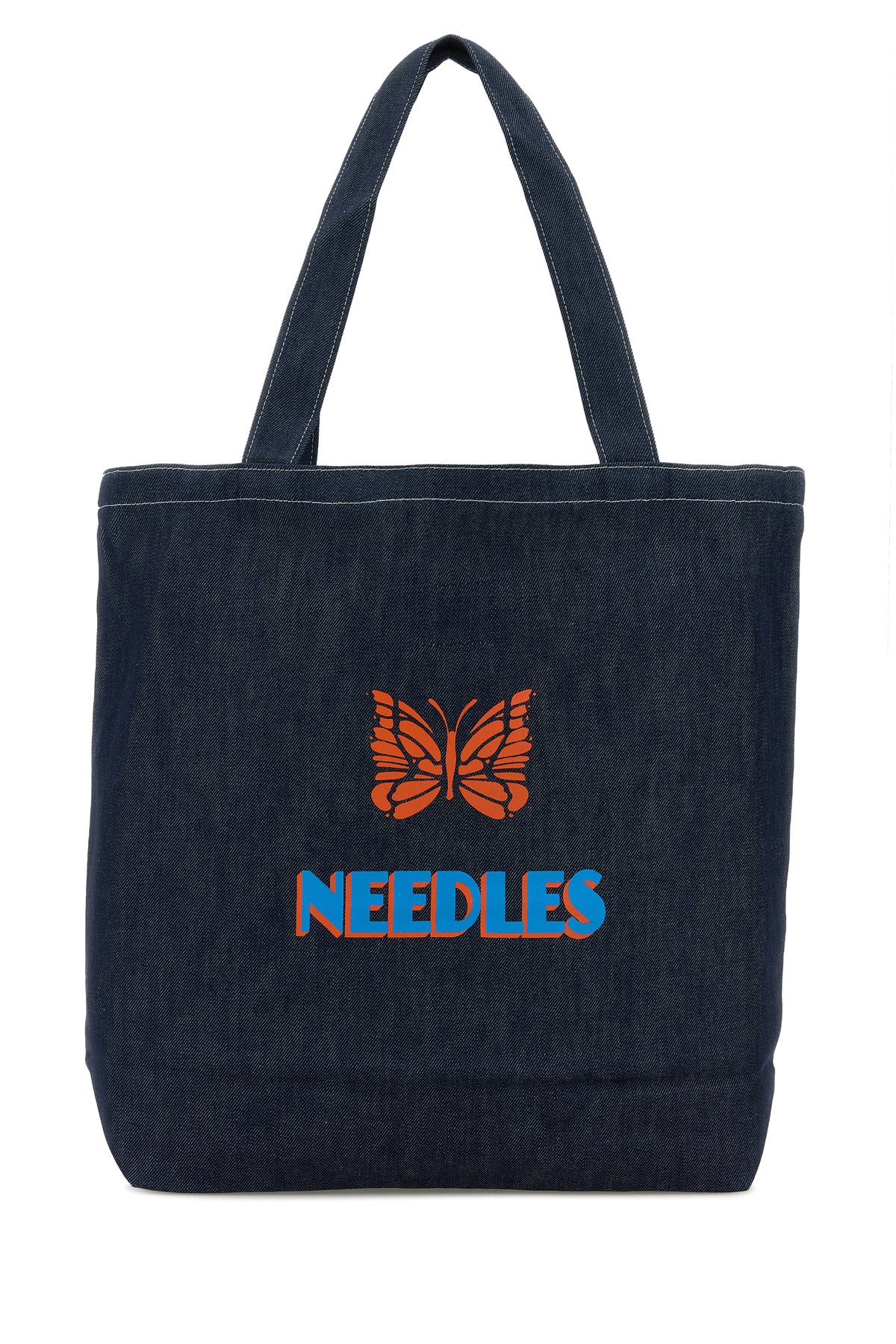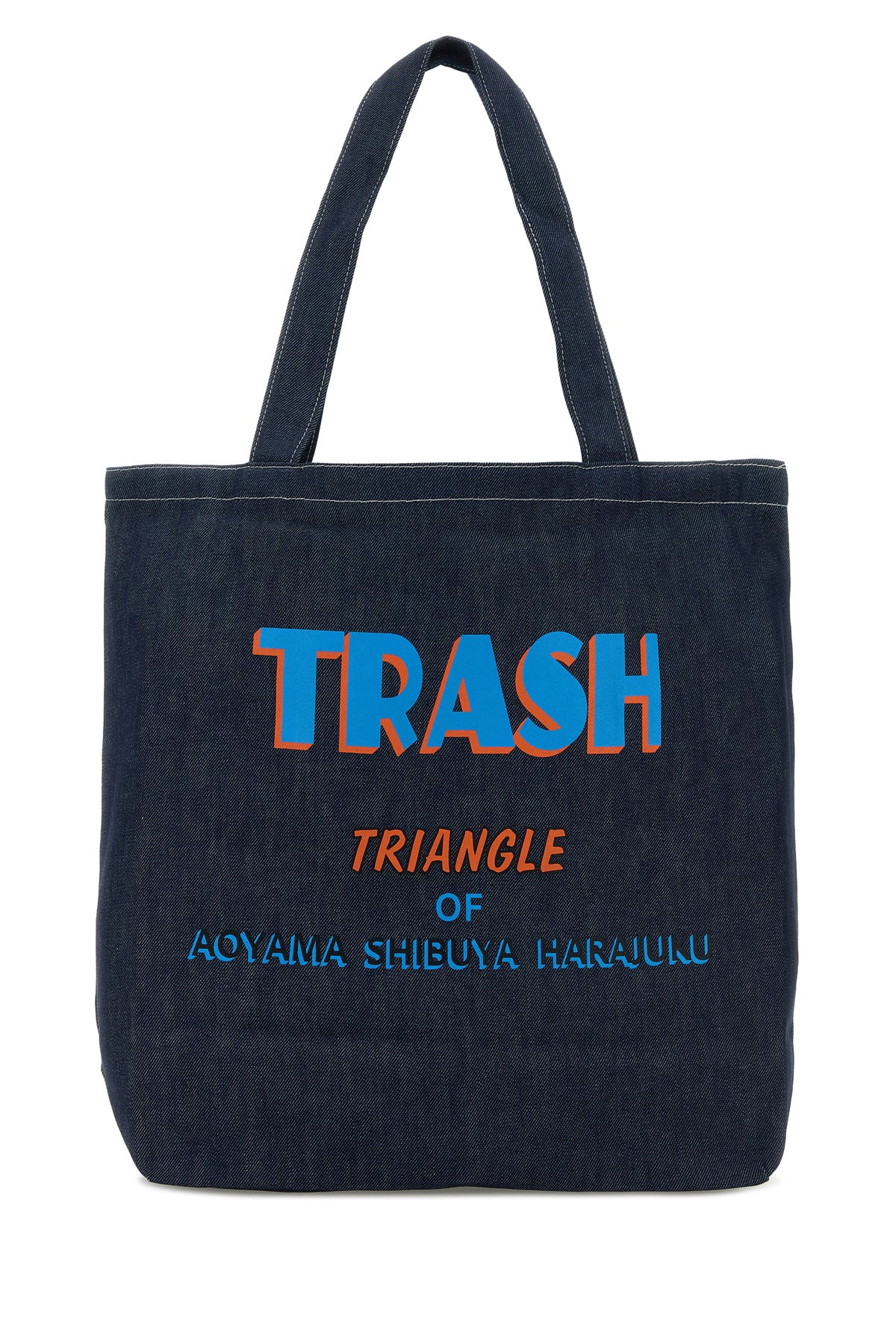Shopping bag realized in denim characterized by logoed print at the front and at the back.