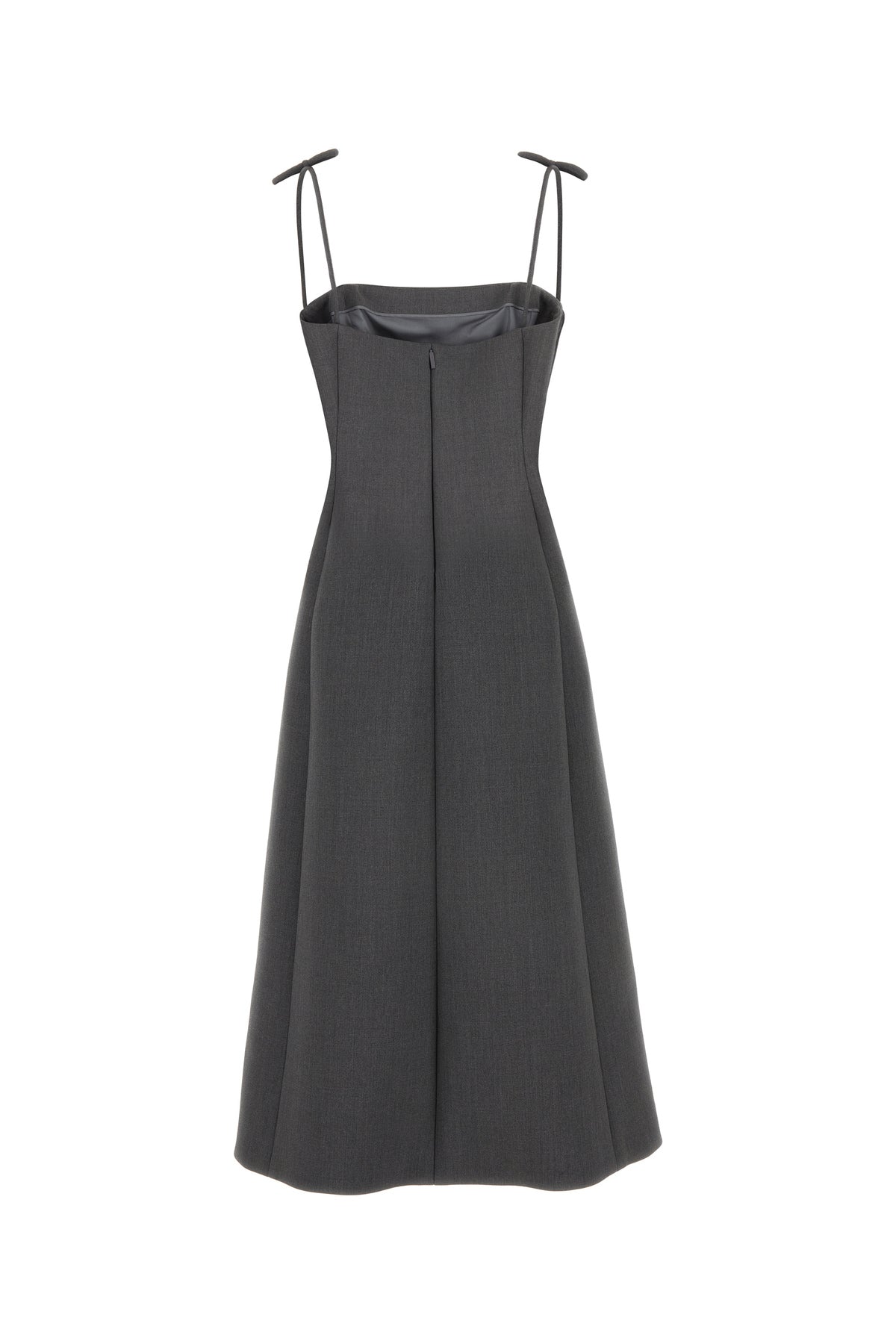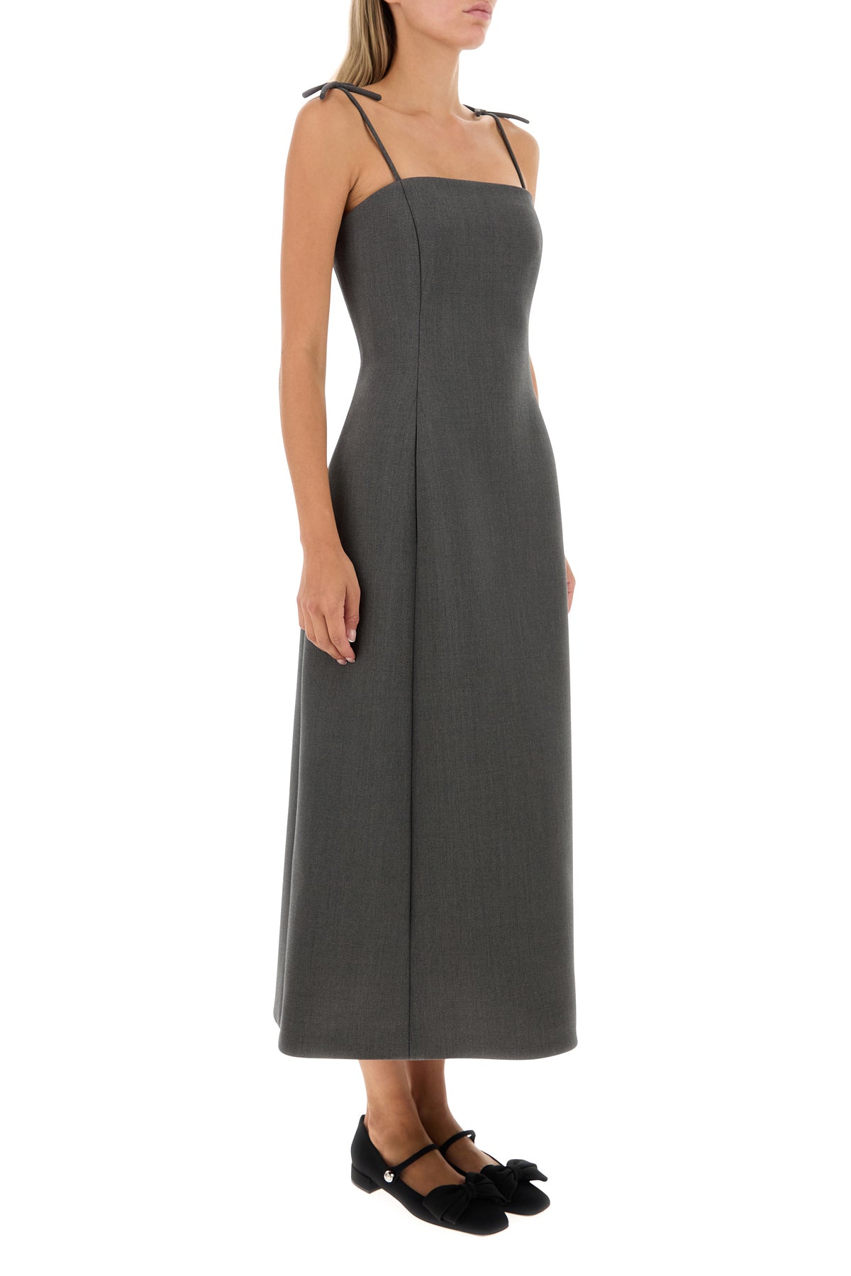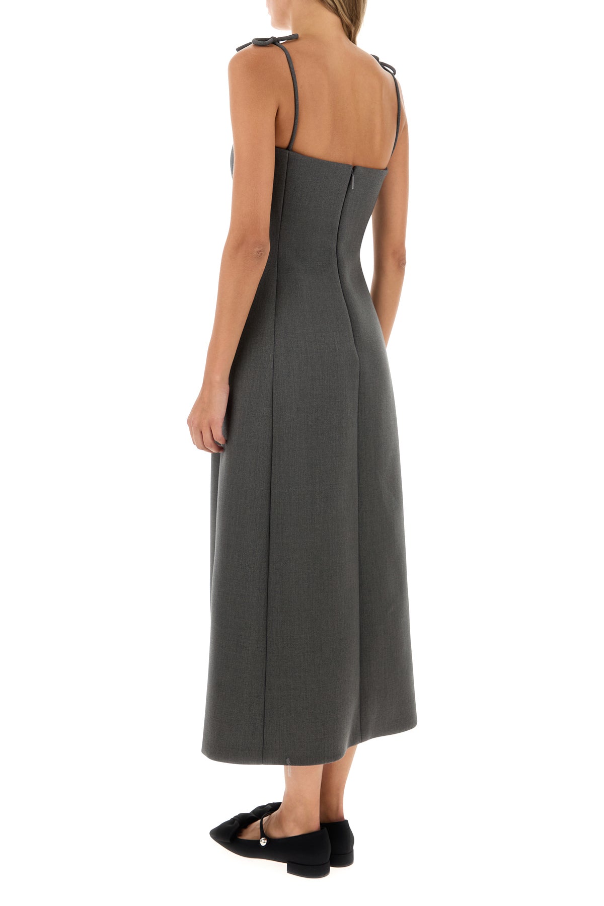 Dress realized in stretch wool enriched by decorative bows on the thin shoulder straps.