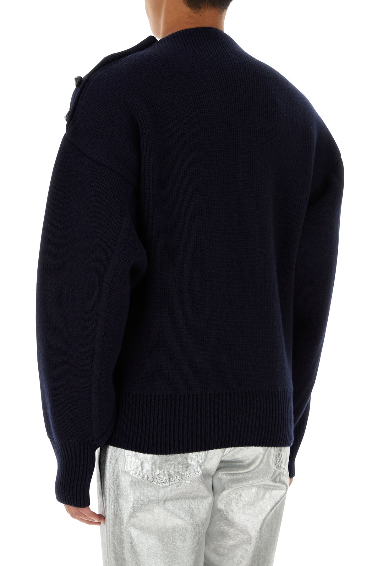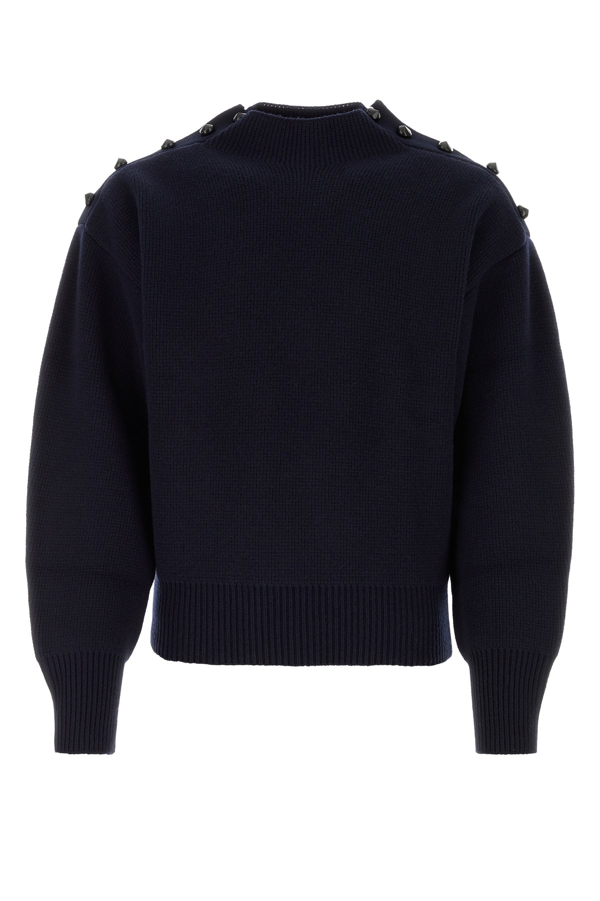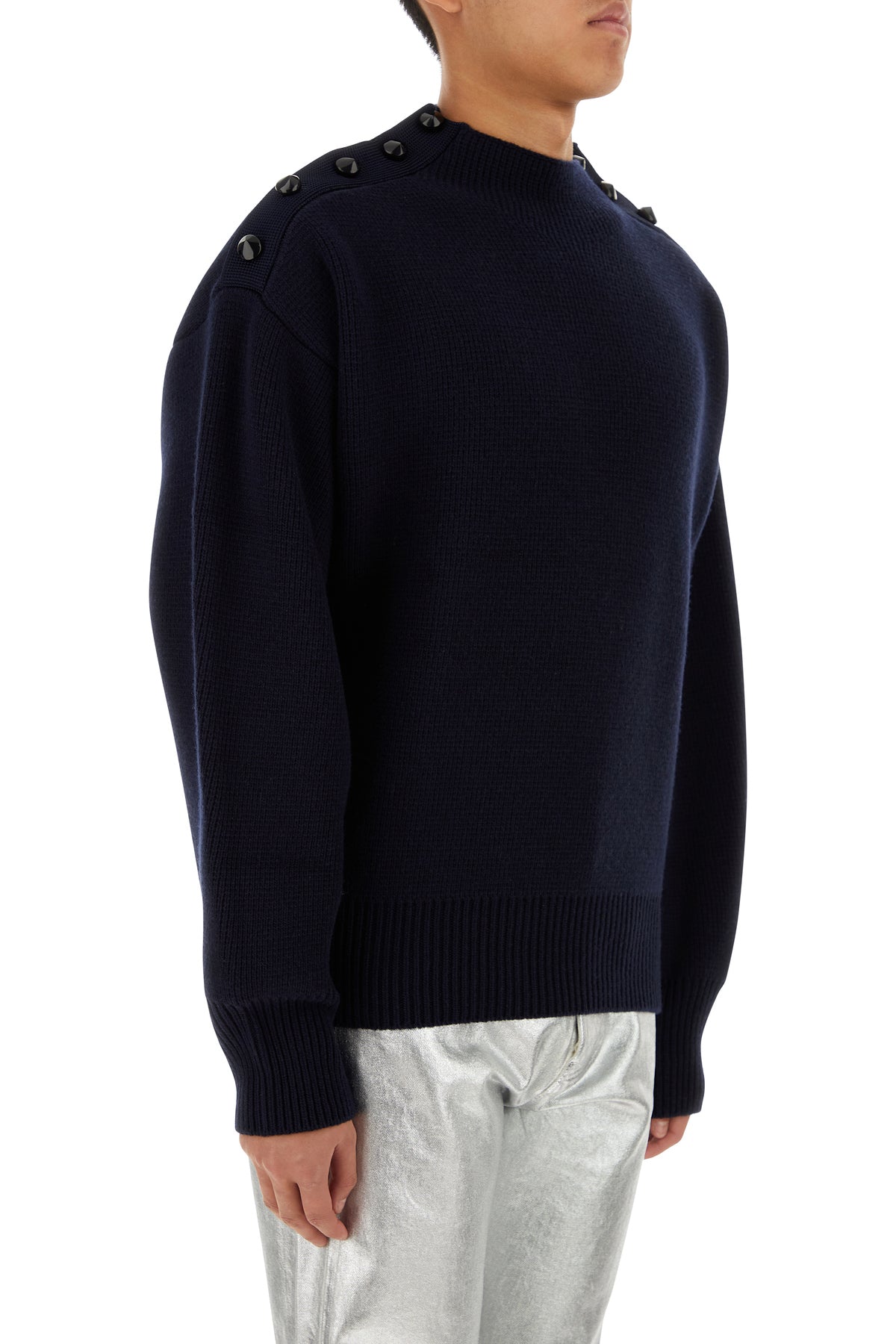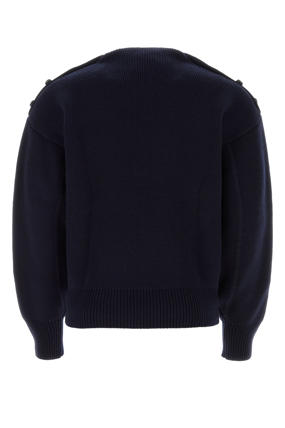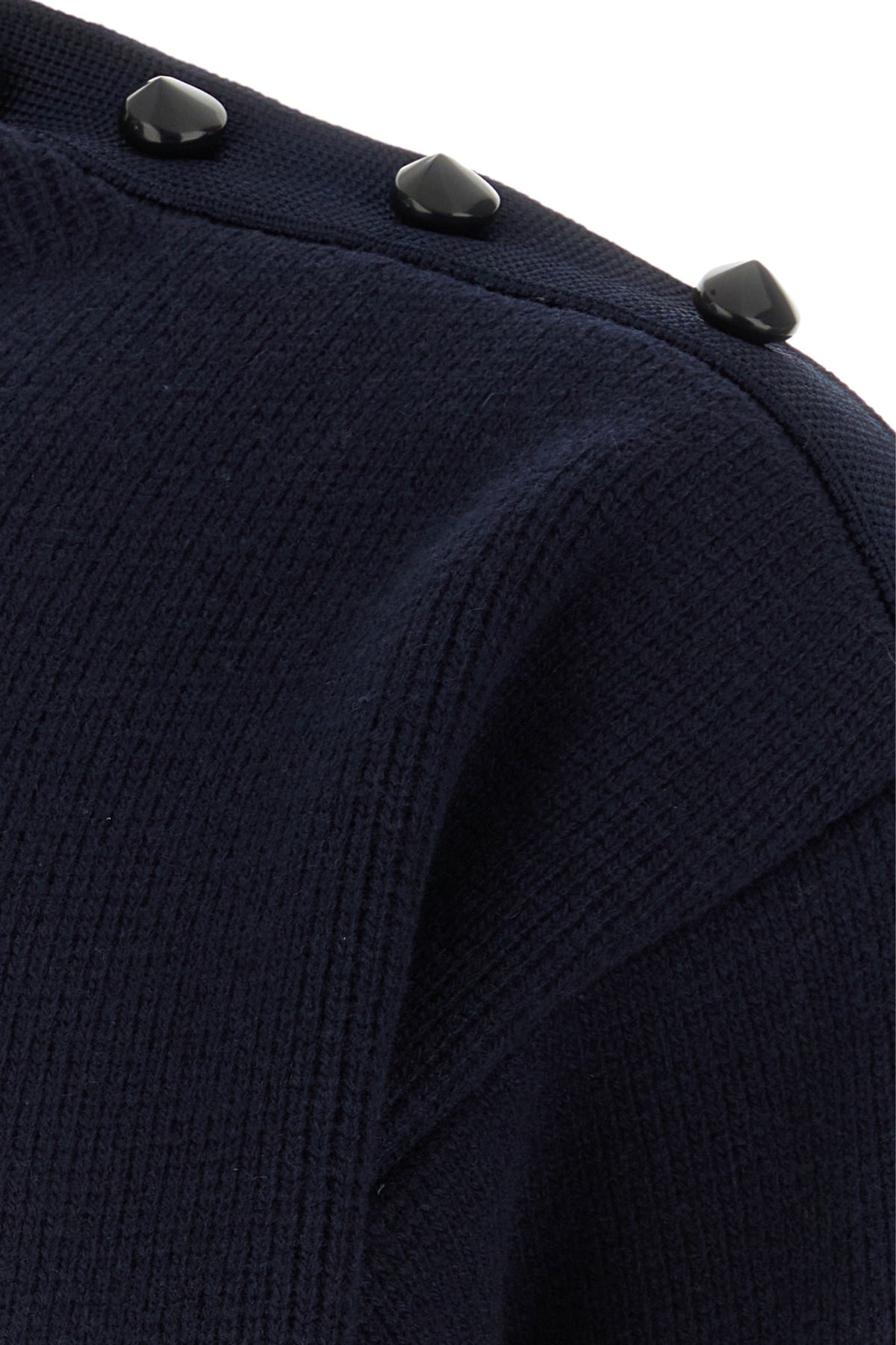 Sweater realized in wool blend enriched by peculiar buttons on the shoulders.