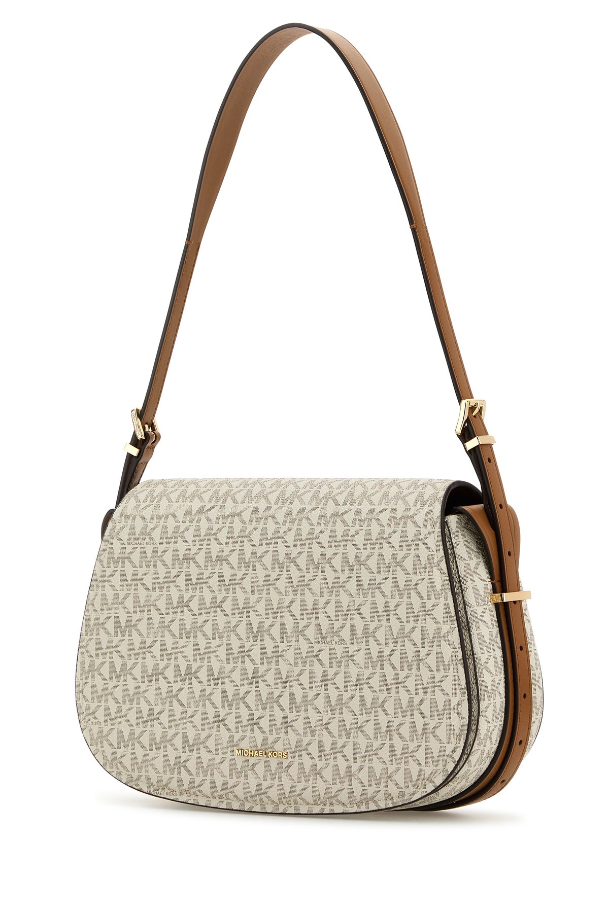 Shopping bag realized in coated grained canvas characterized by logoed print on the entire surface enriched by metal lettering logo at the front.