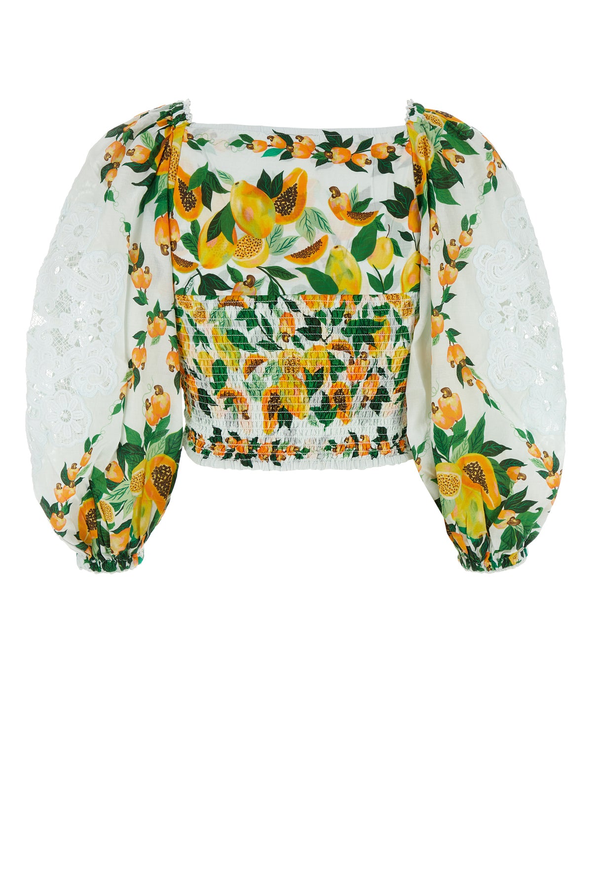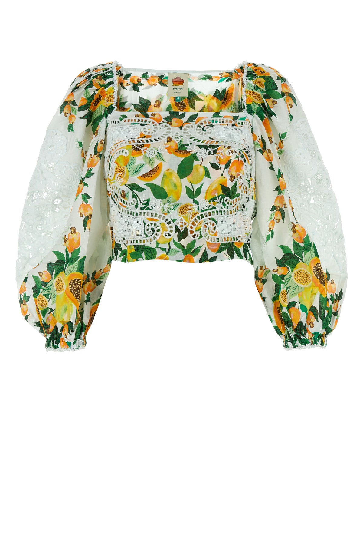 Short-cut blouse realized in pure cotton with macrame lace insets on the sleeves characterized by peculiar print on the entire surface.