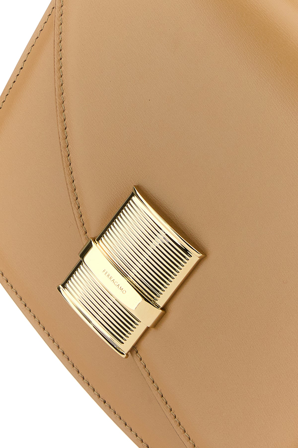Crossbody bag realized in slightly pebble leather enriched by logoed metal detail at the front.