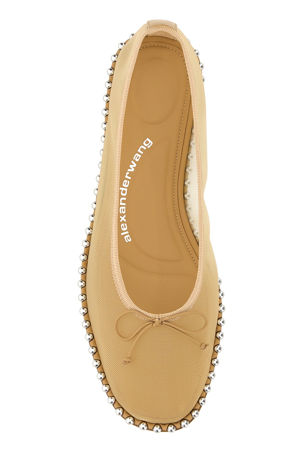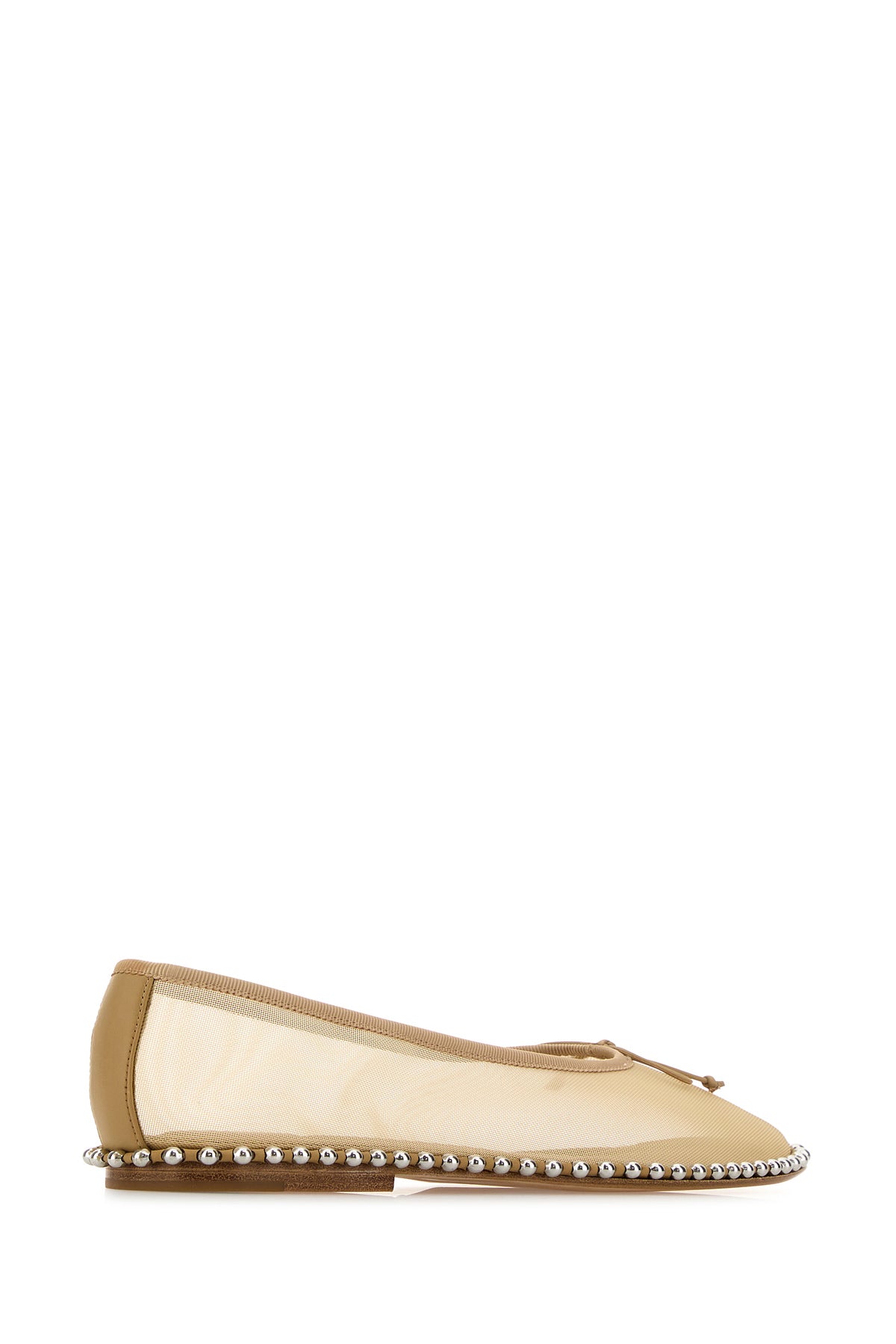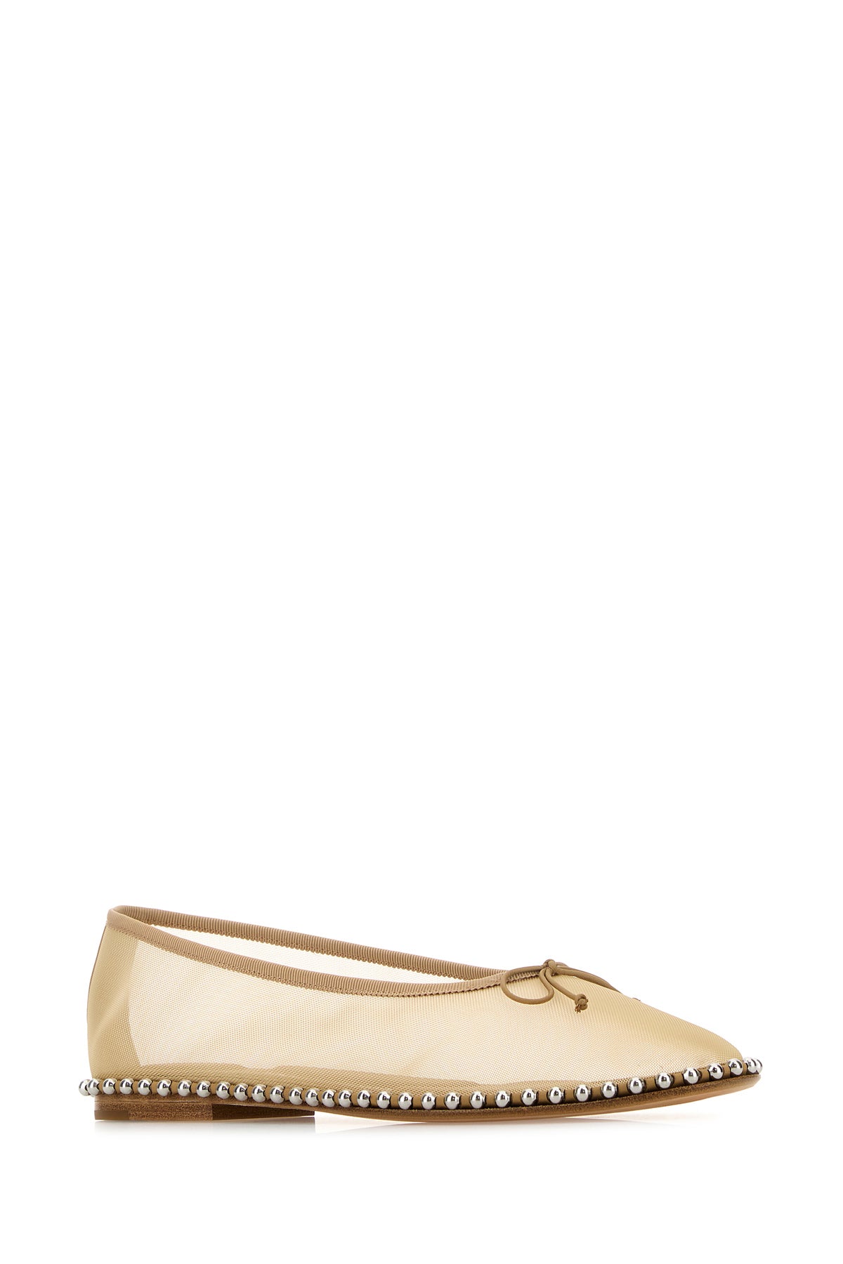 Ballerinas realized in mesh enriched by metal studs on the hemline and decorative bow at the front.