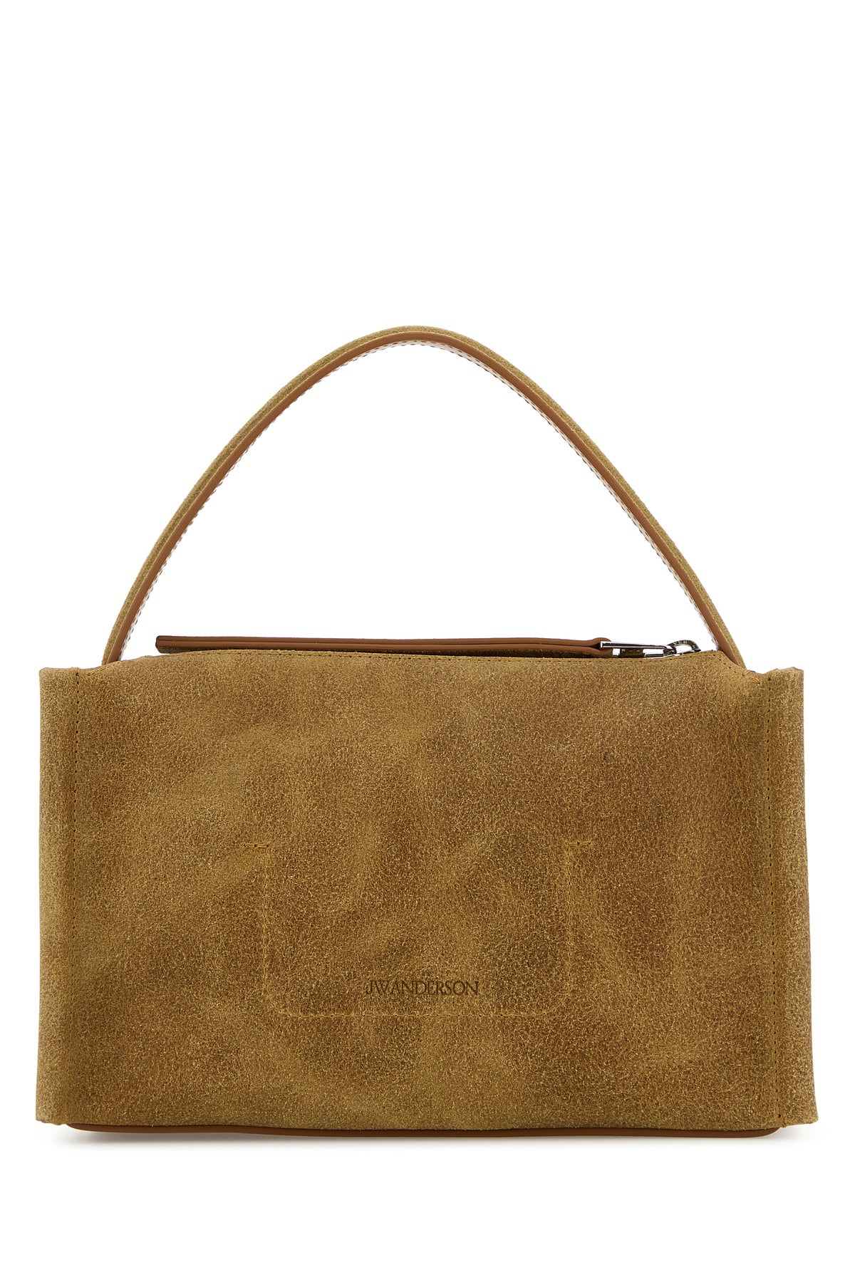 Handbag realized in suede characterized by embossed logo at the back enriched by peculiar patch at the front.