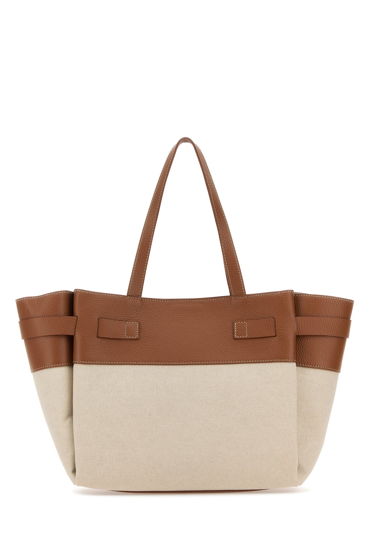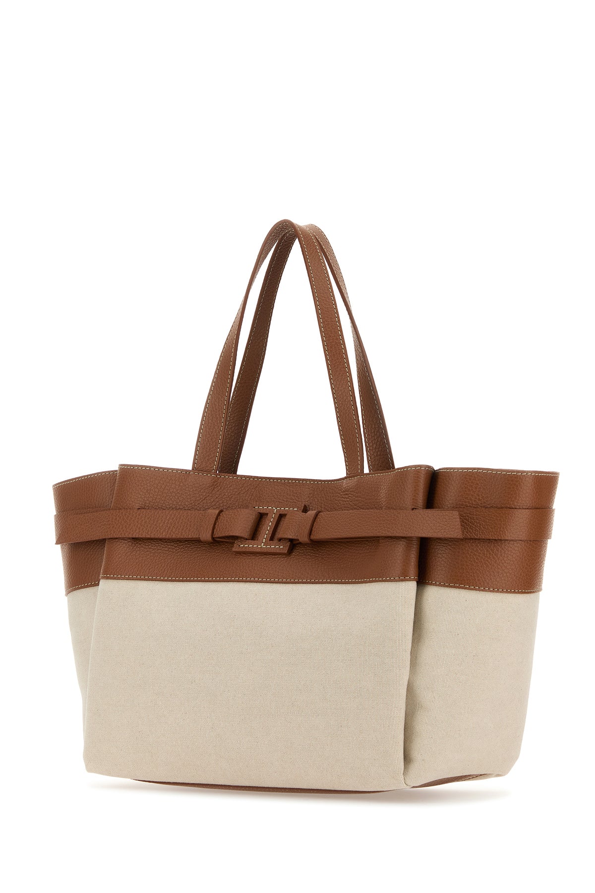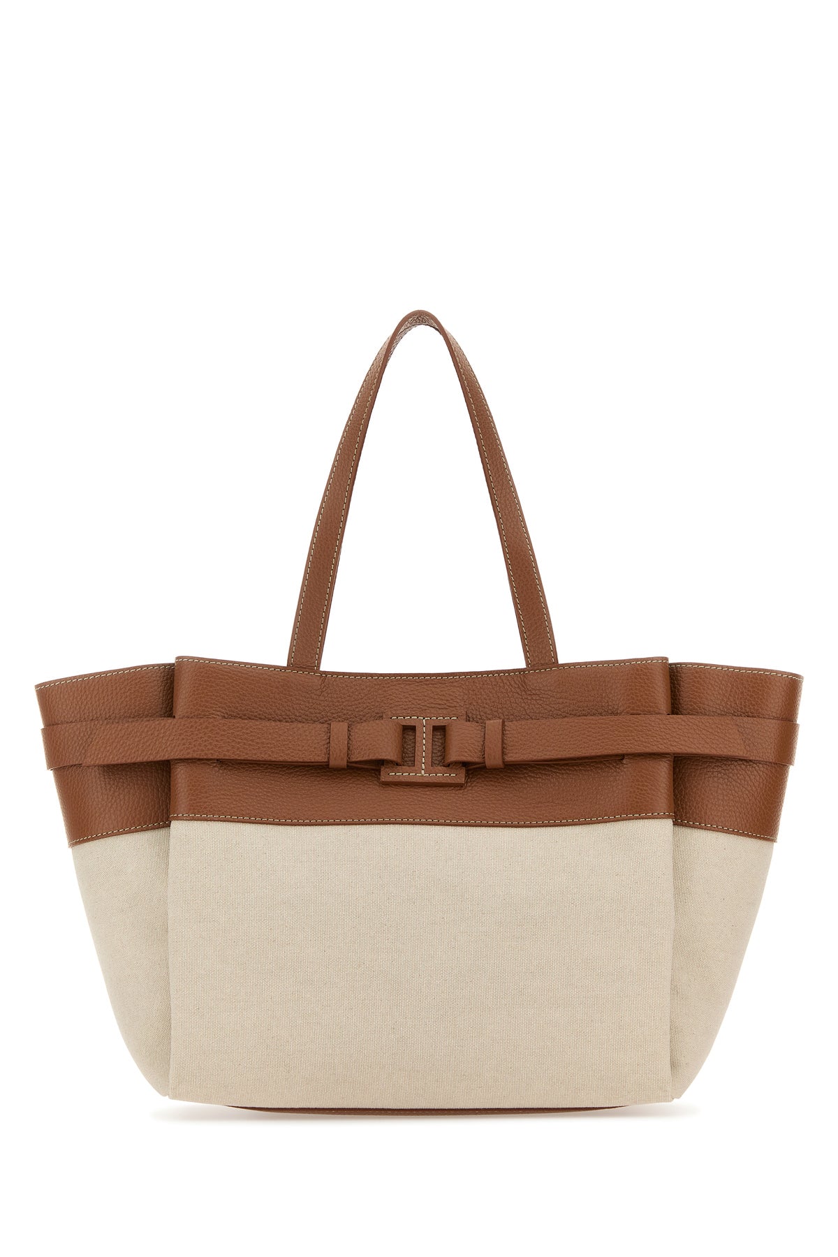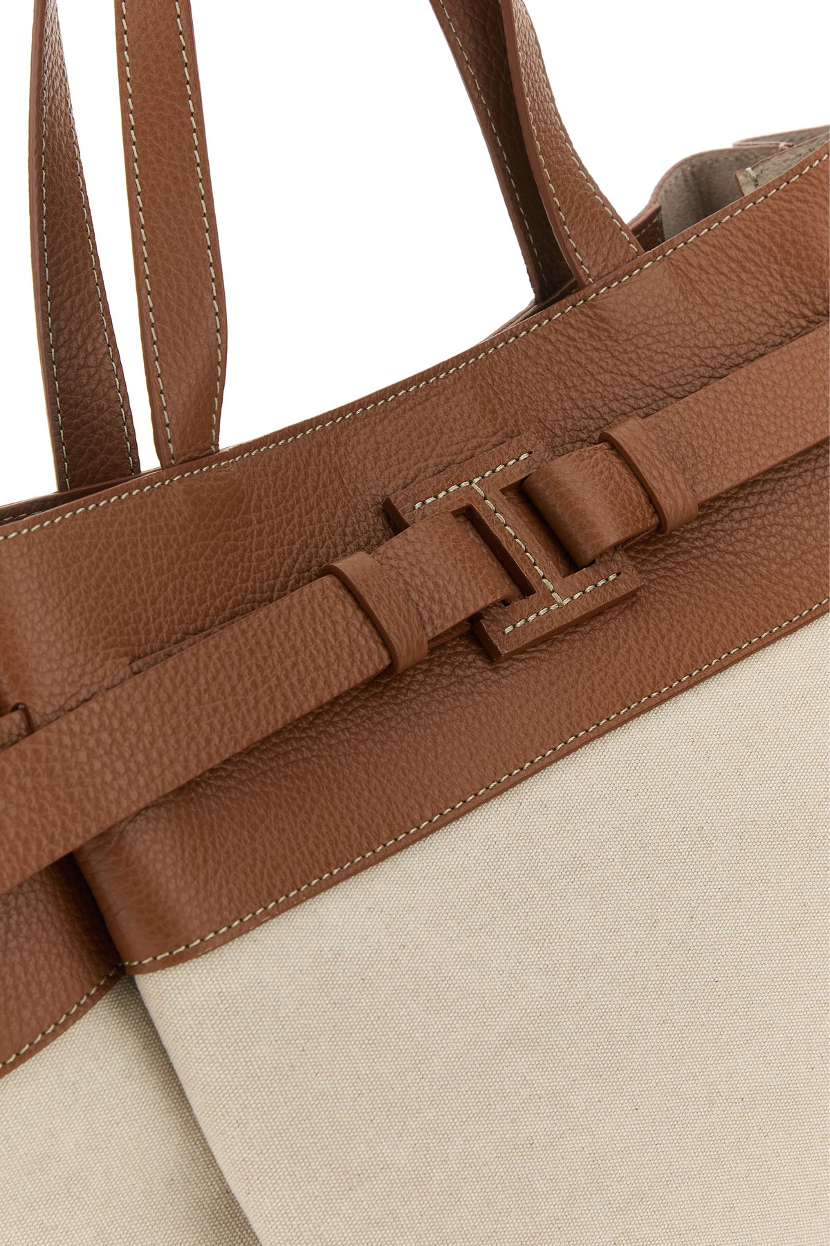 Handbag realized in canvas and pebble deer leather characterized by side straps to adjust the capacity.