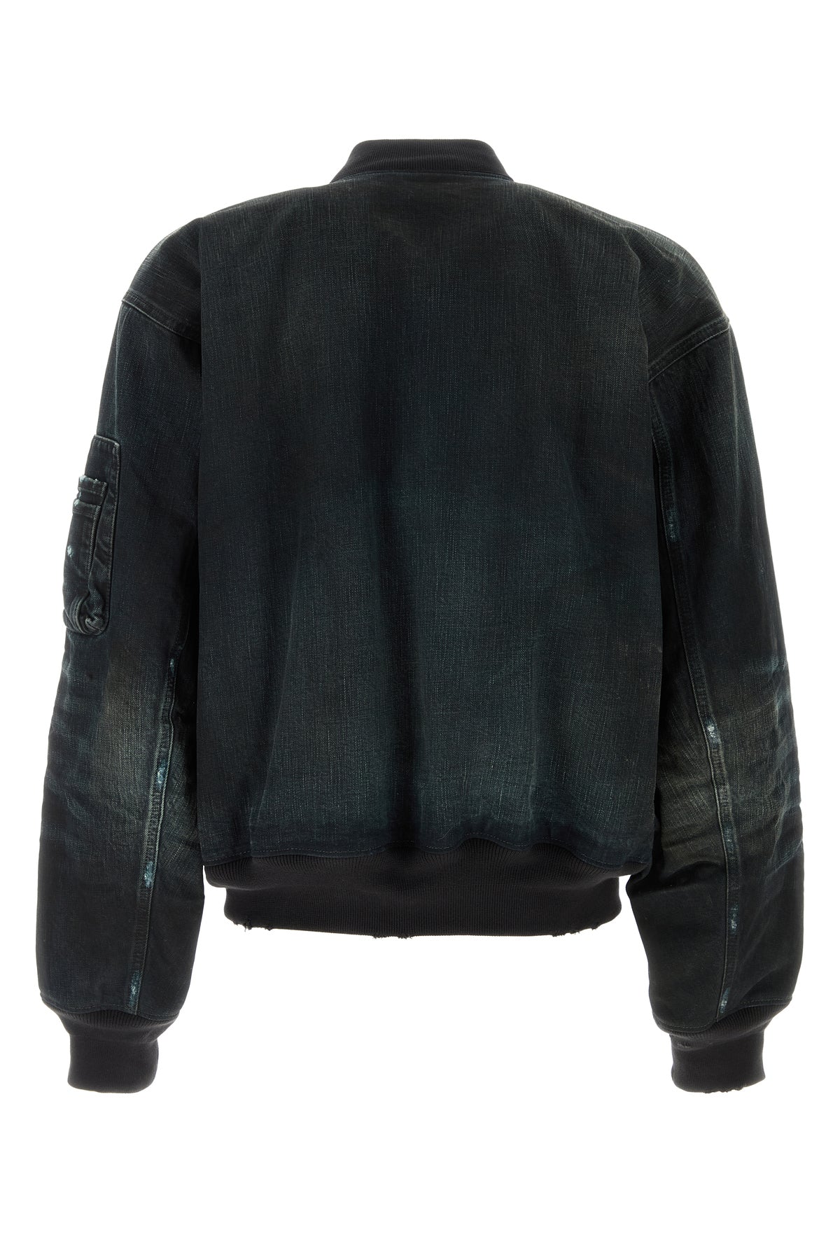 Bomber jacket realized in stonewashed and distressed pure cotton denim characterized by ribbed crew-neck, cuffs and hemline.