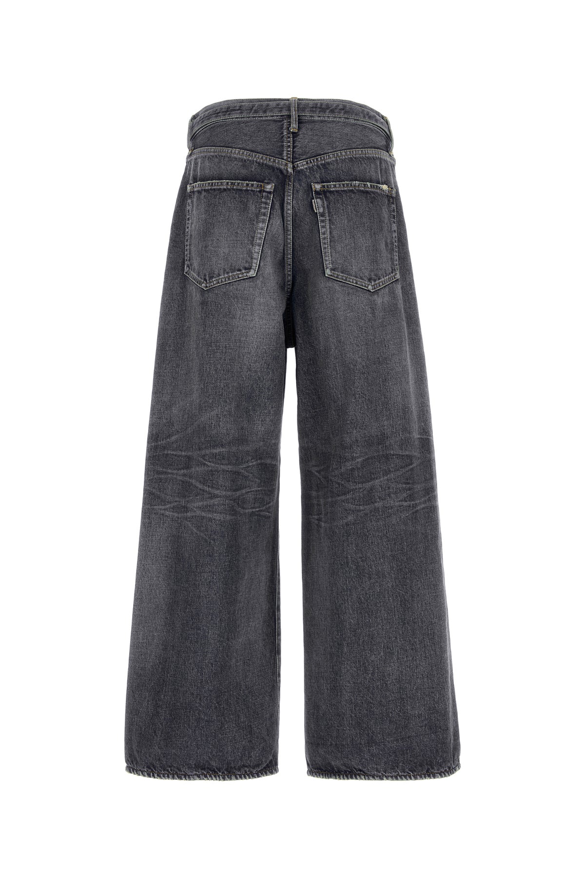 Baggy jeans realized in distressed and stonewashed pure cotton denim enriched by detachable belt with logoed safety-buckle.