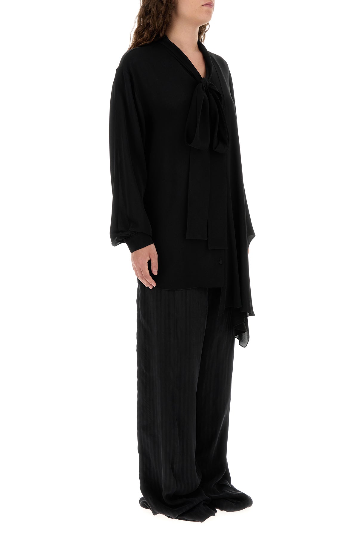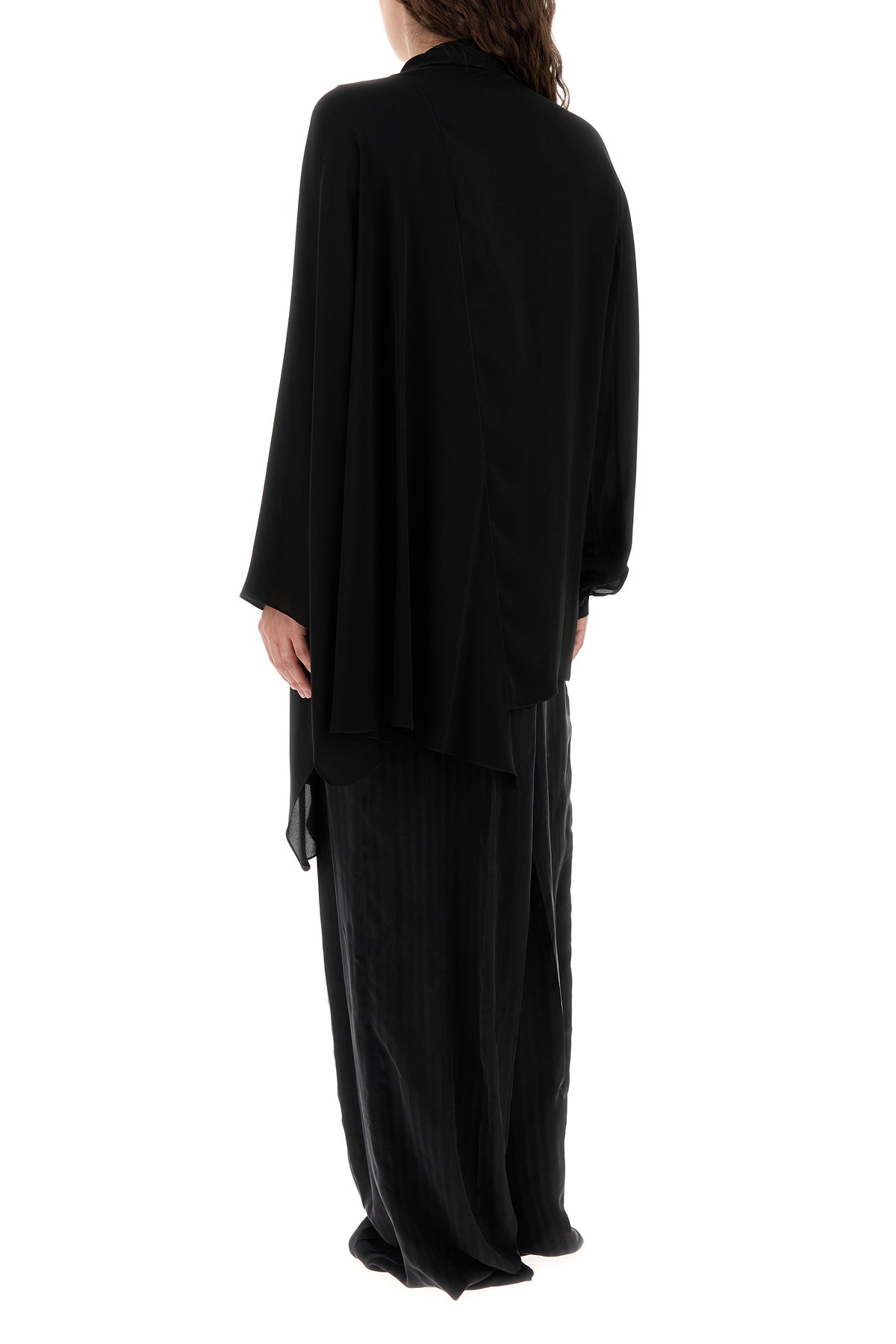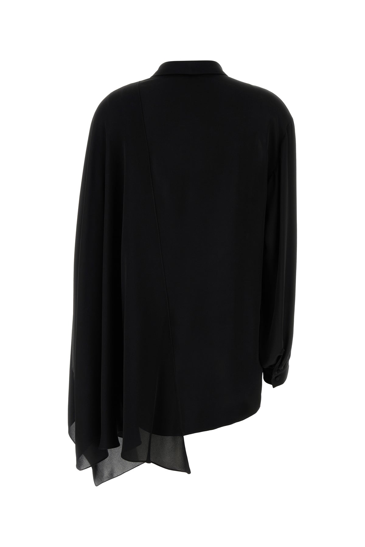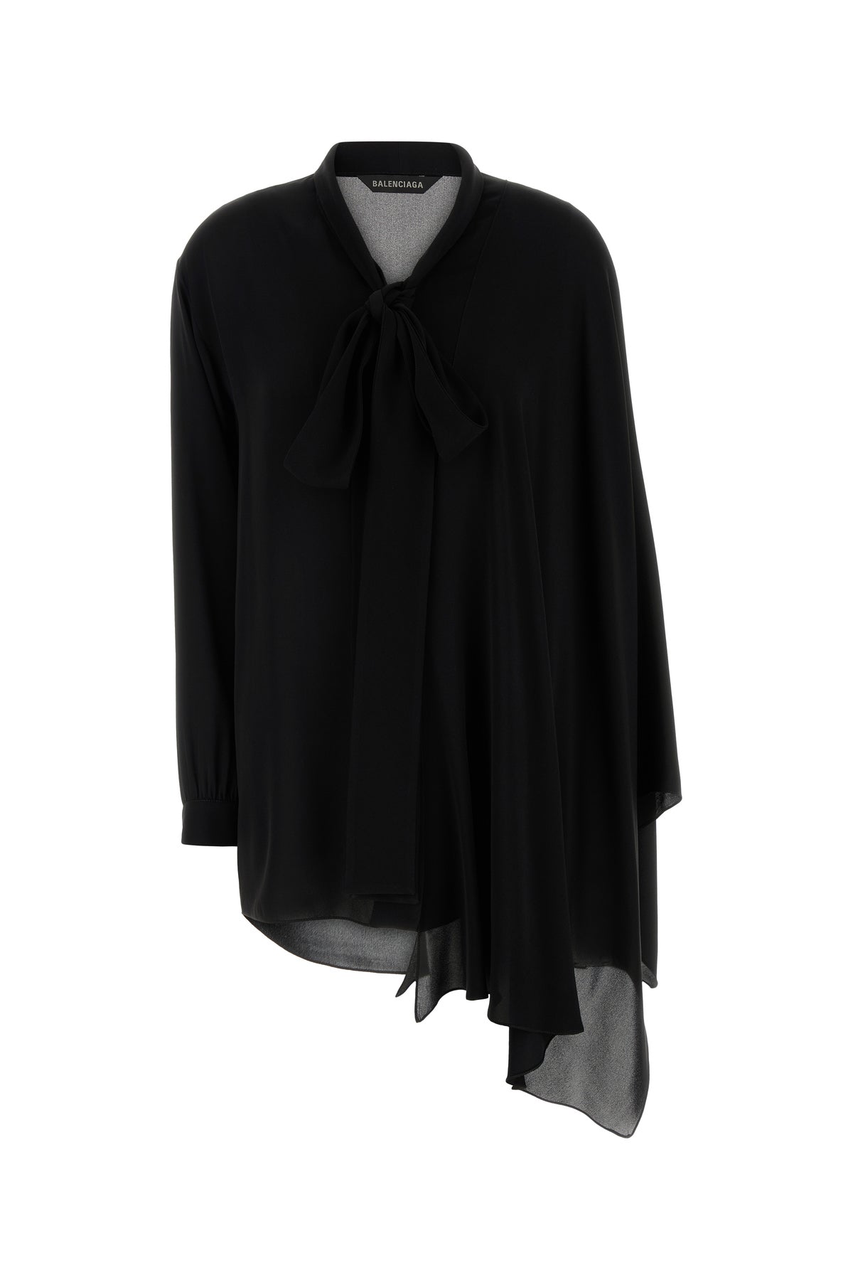 Asymmetric blouse realized in pure silk georgette enriched by ribbons to tie at the neck.
