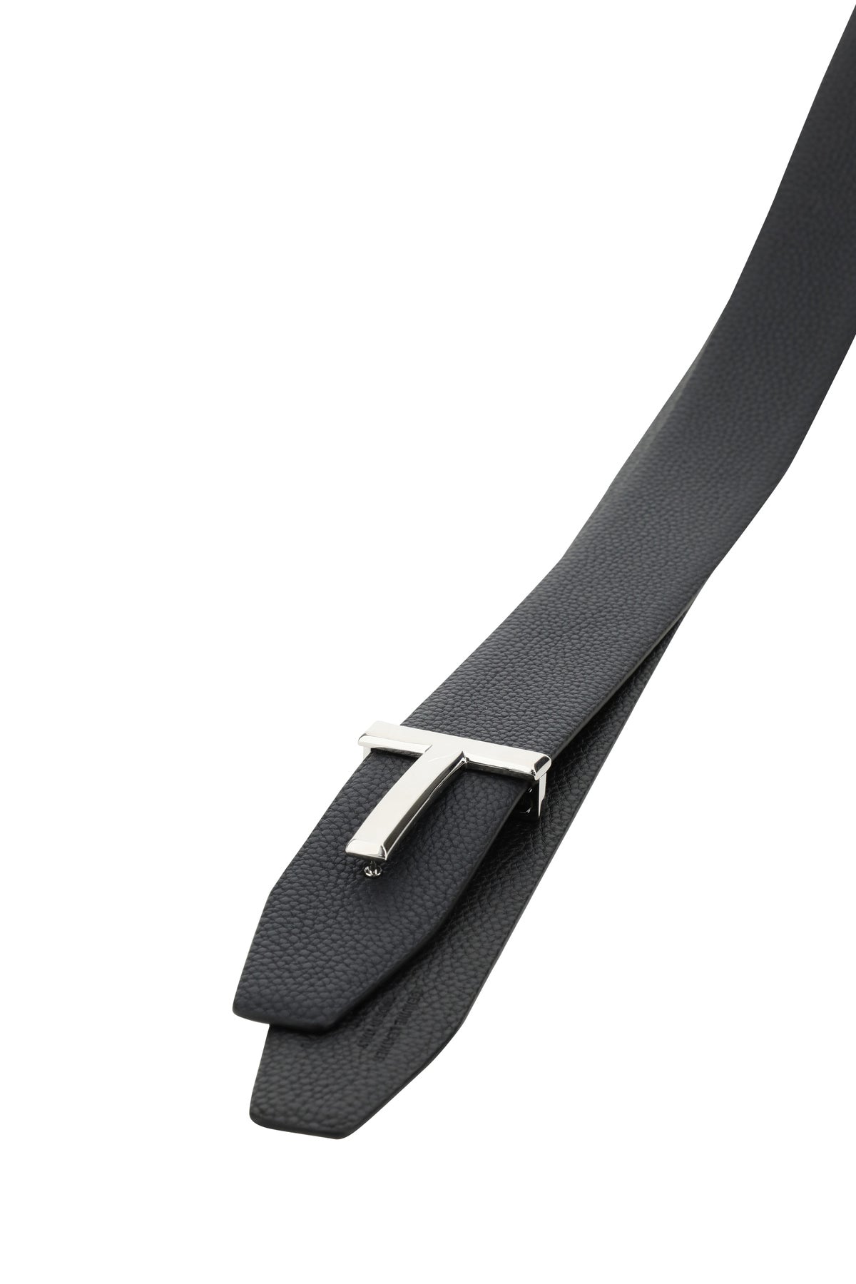 Belt realized in pebble leather enriched by metal logoed safety buckle.