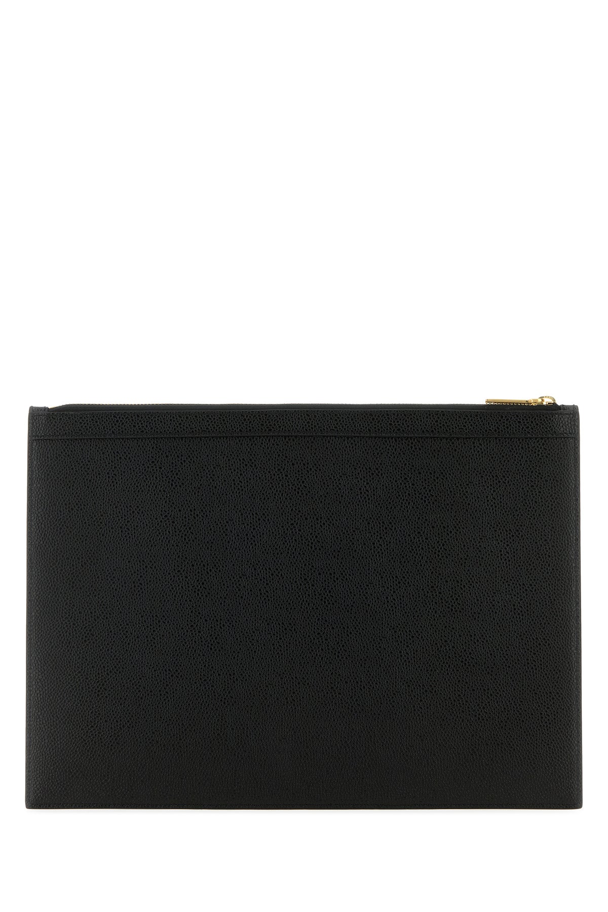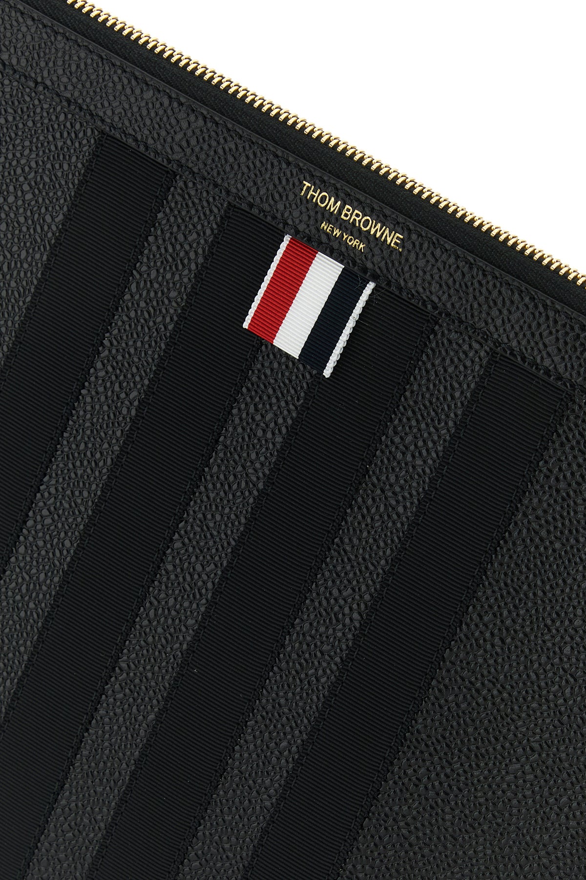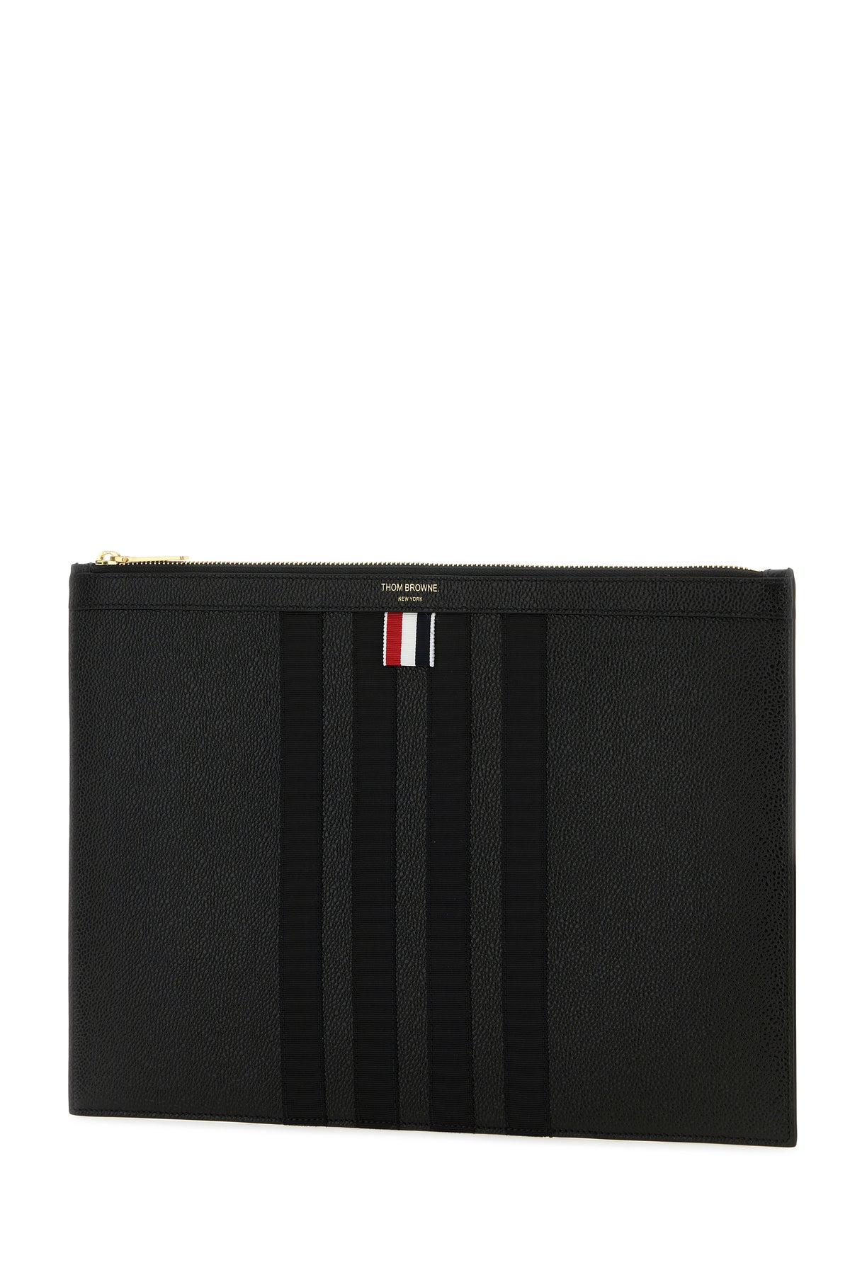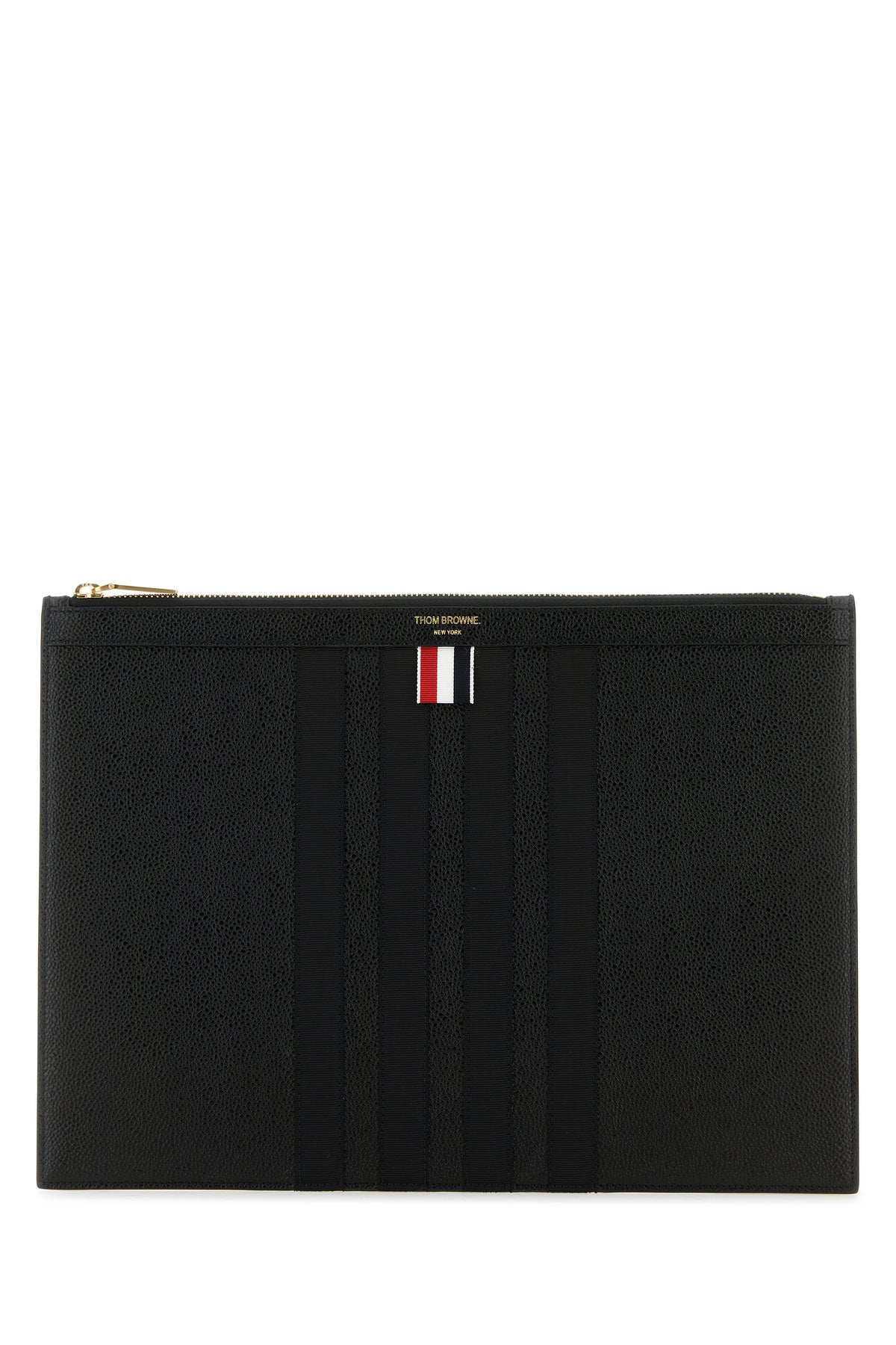 Clutch realized in pebble calf leather characterized by contrasting printed logo at the front enriched by iconic tricolor label at the front.