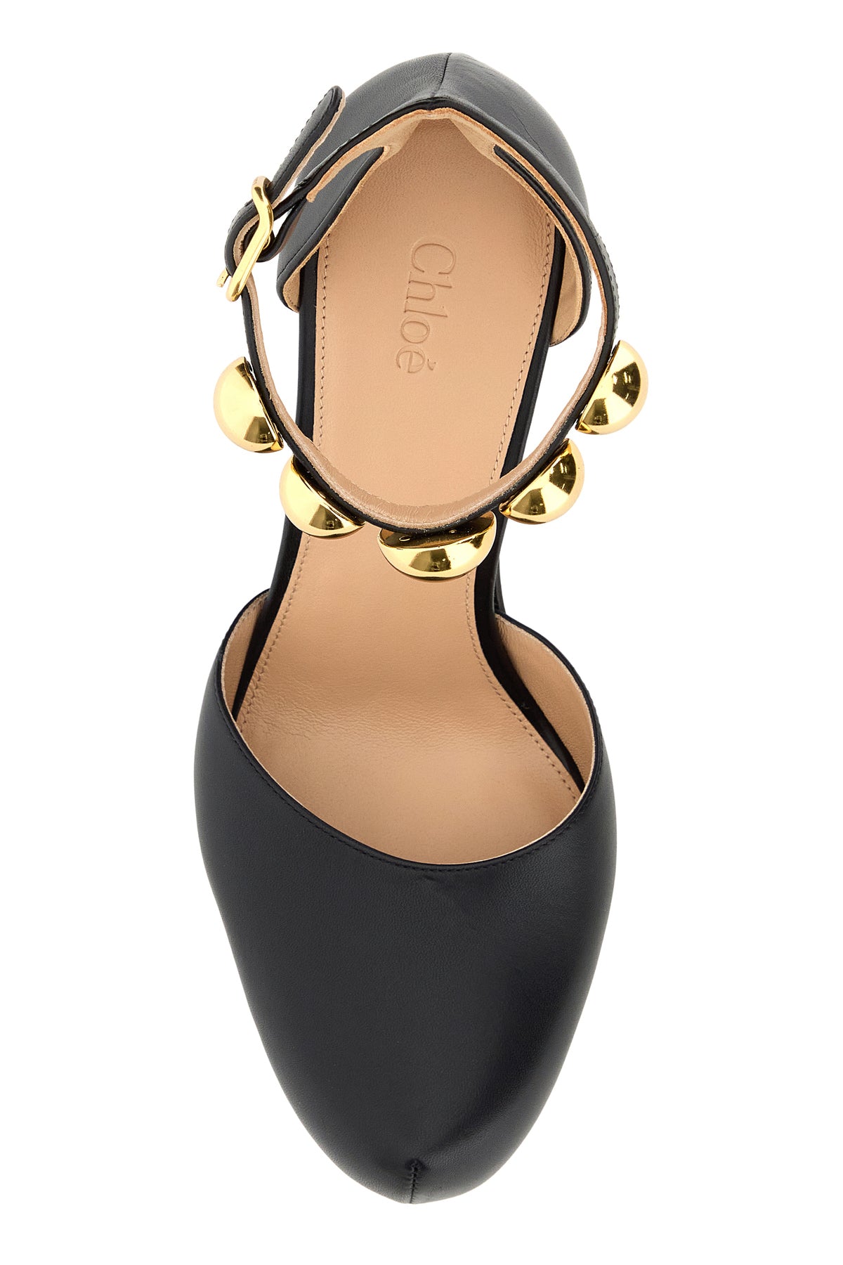 Pumps realized in smooth leather enriched by maxi metal studs on the strap.