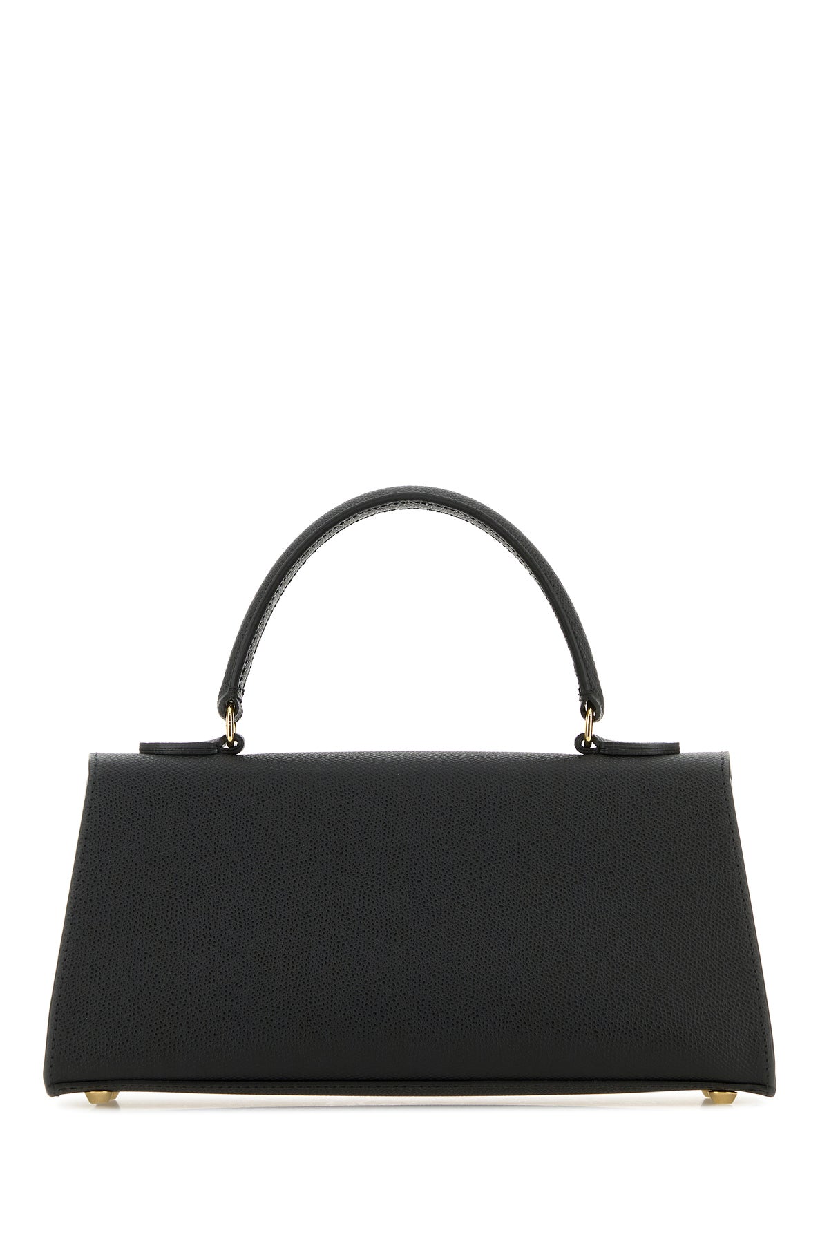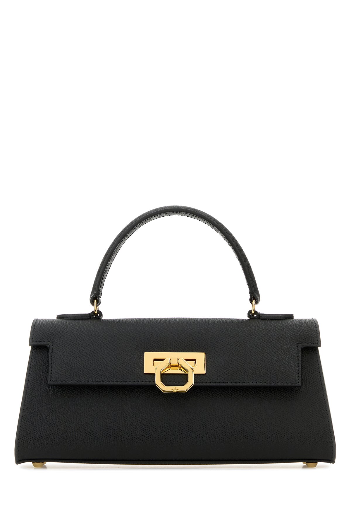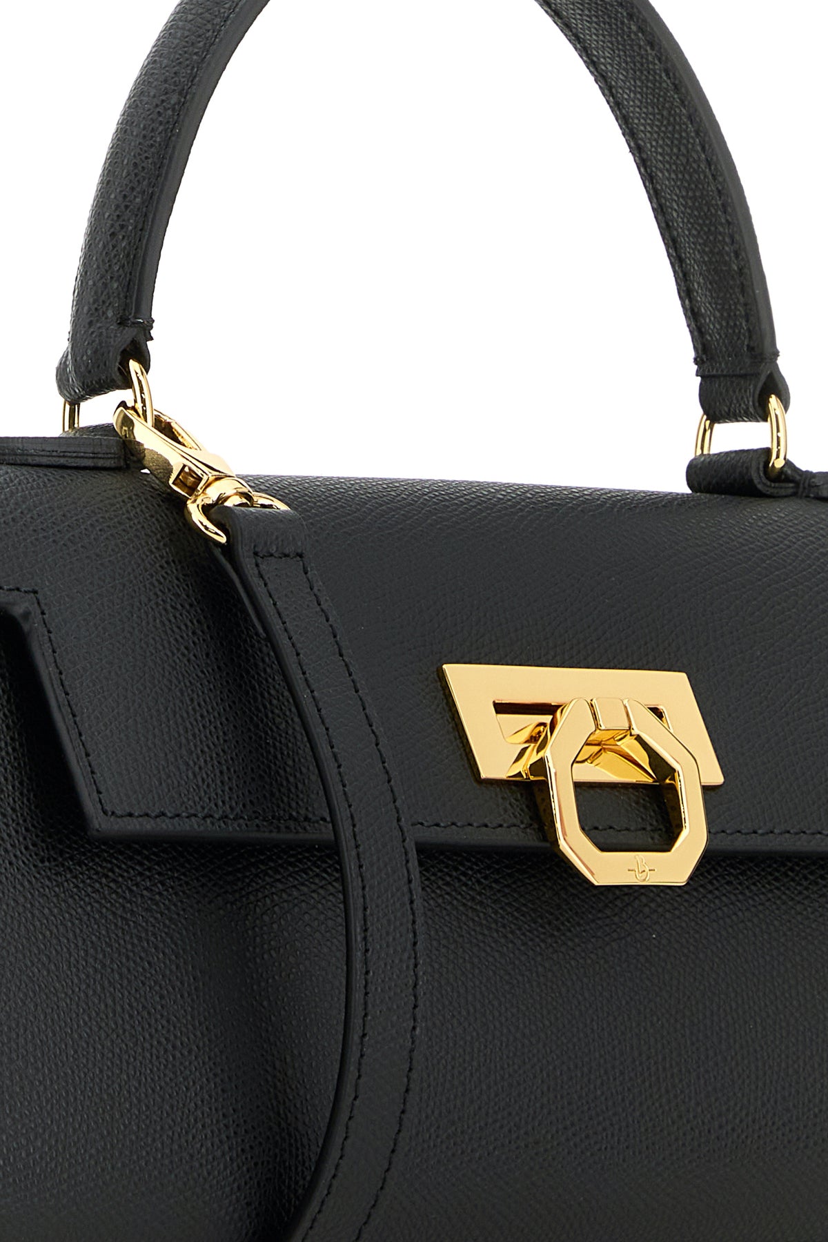 Handbag realized in grained calf leather characterized by snap-fit closure.