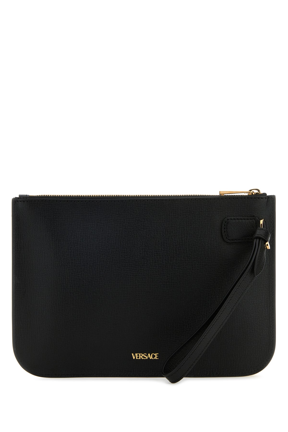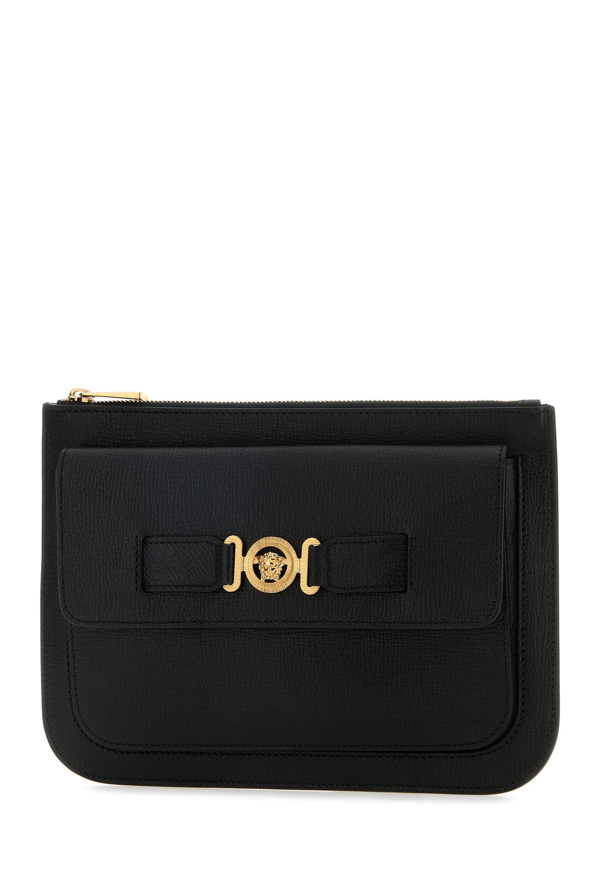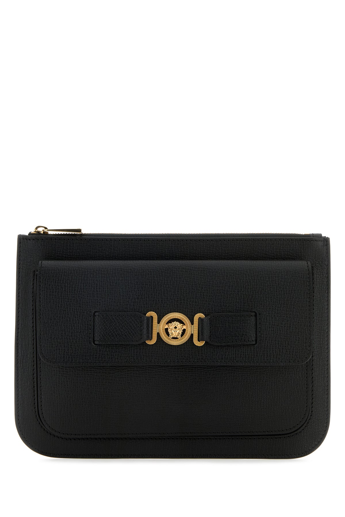 Clutch realized in pebble ovine leather characterized by printed laminated logo at the back enriched by metal Medusa Biggie detail at the front.