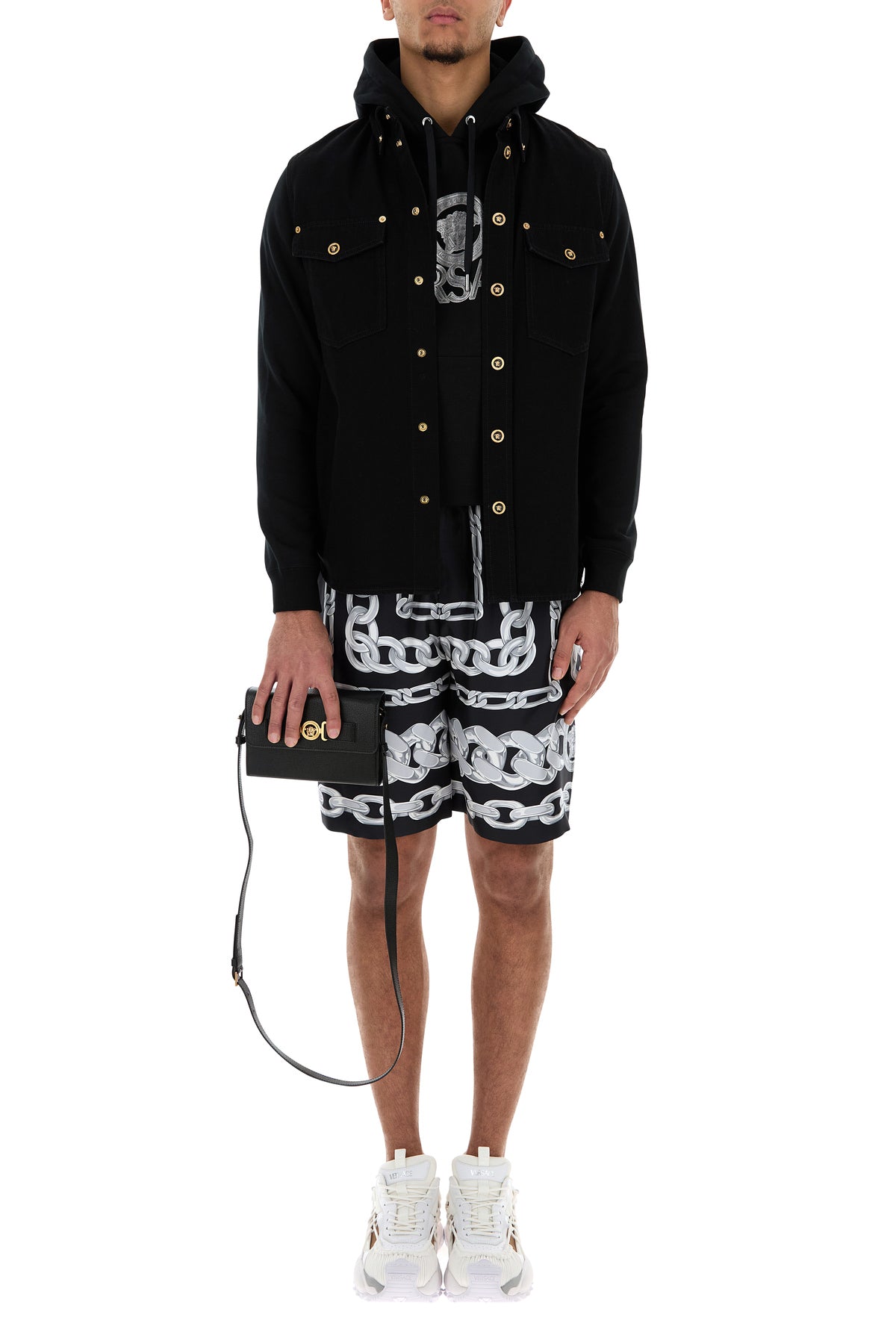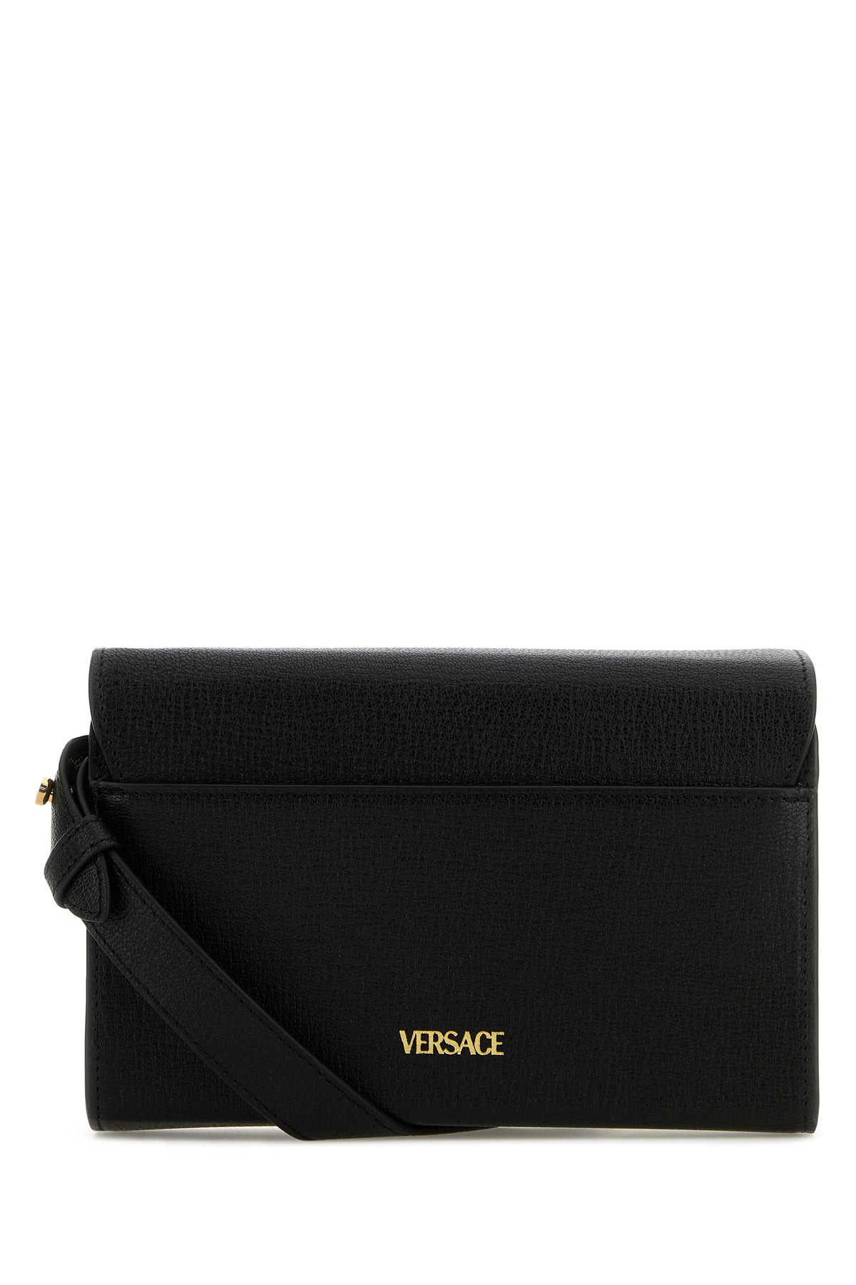 Crossbody bag realized in grained ovine leather characterized by printed laminated logo at the back enriched by metal Medusa Biggie detail at the front.