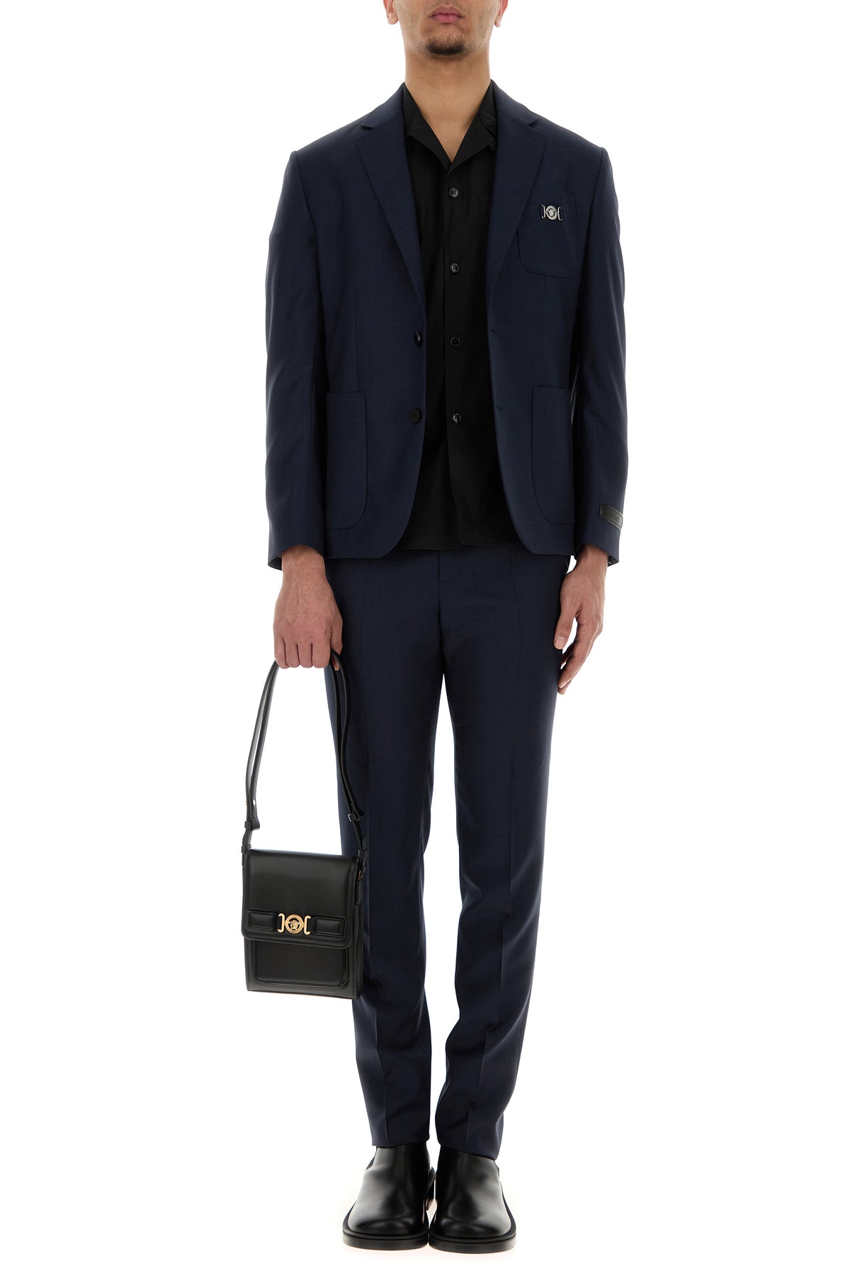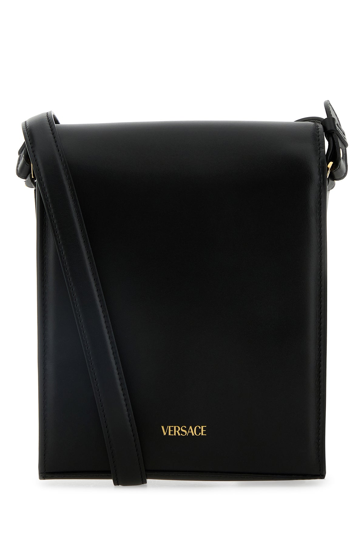 Crossbody bag realized in smooth leather characterized by laminated printed logo at the back enriched by metal Medusa Biggie detail at the front.