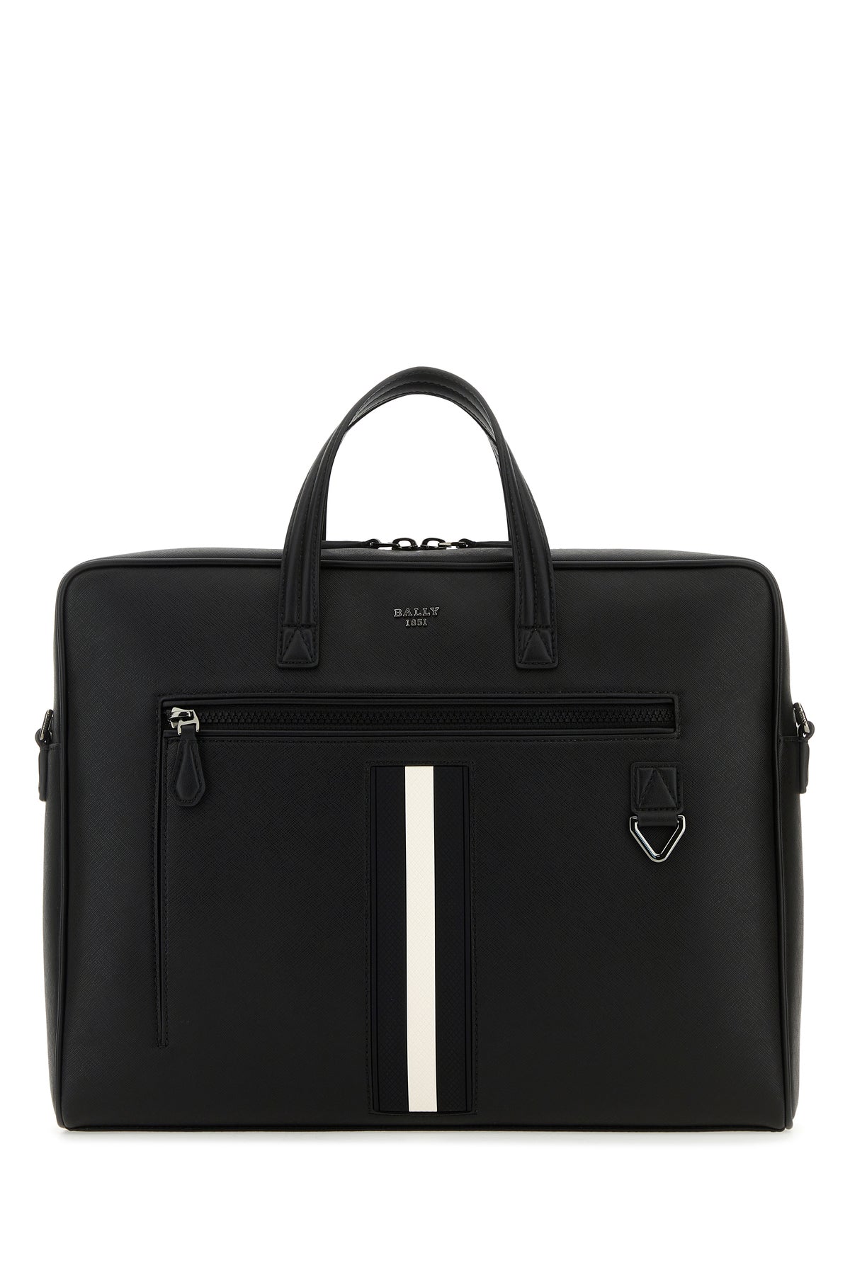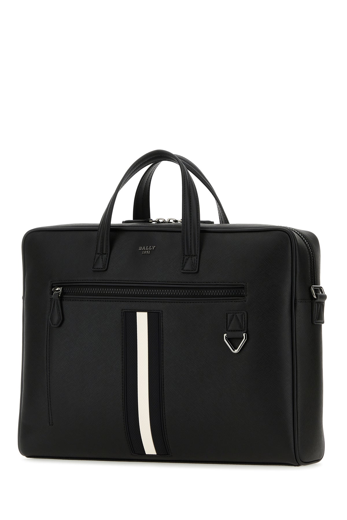 Briefcase realized in grained leather enriched by Bally Stripe detail and metal lettering logo at the front.