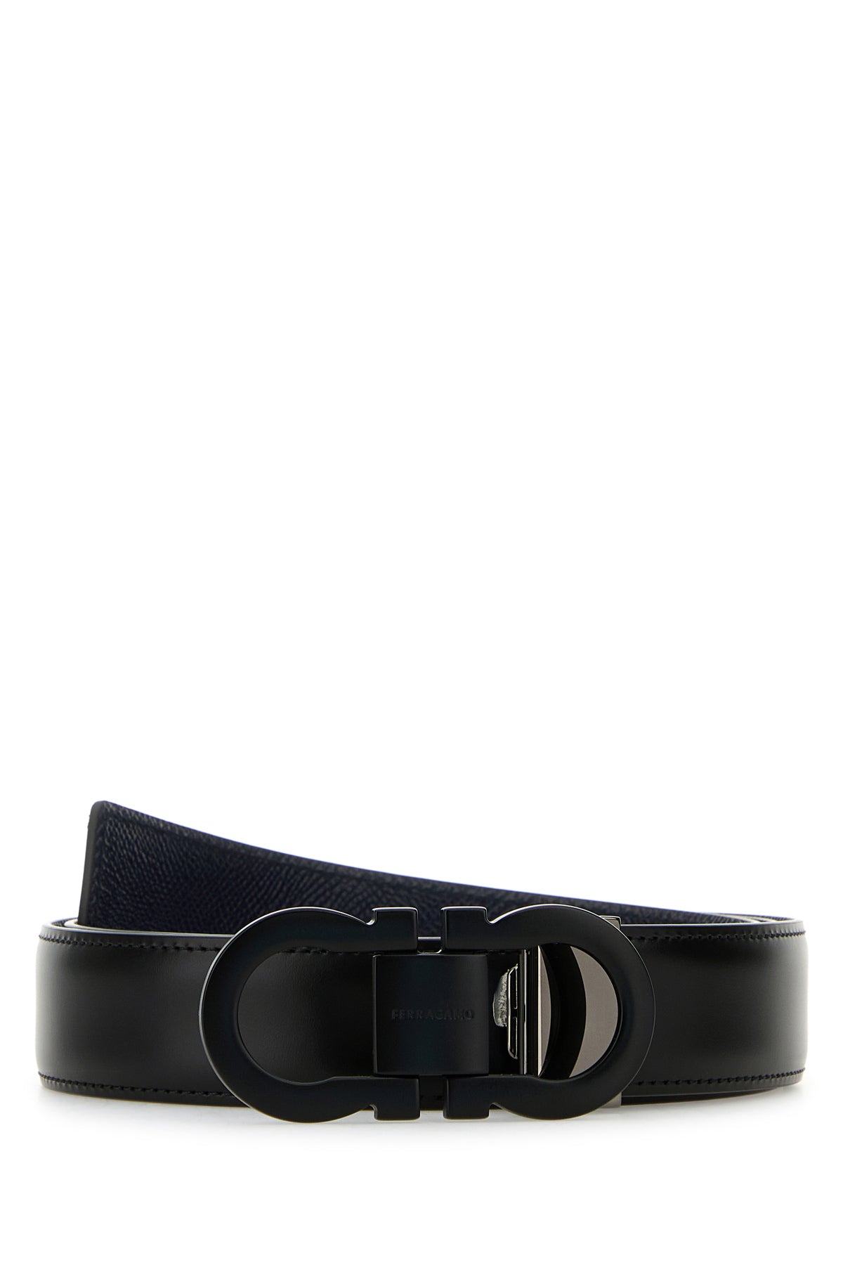 Belt realized in smooth calf leather characterized by metal Gancini motif buckle.