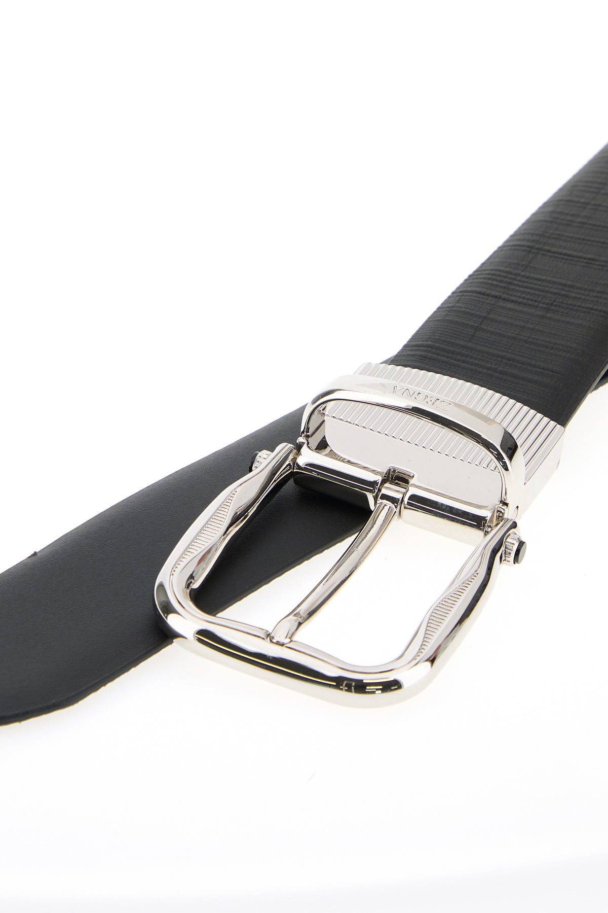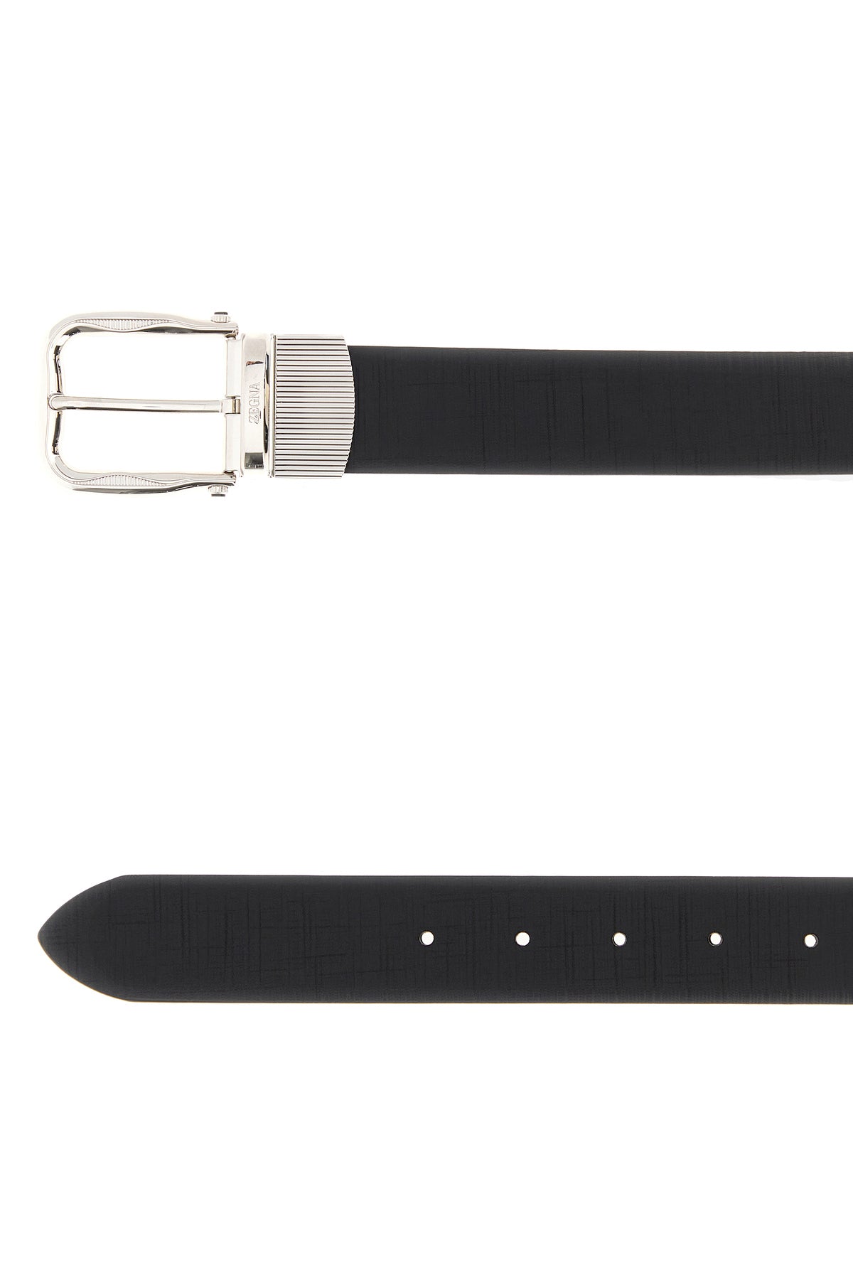 Reversible belt realized in leather characterized by embossed logo on the buckle.