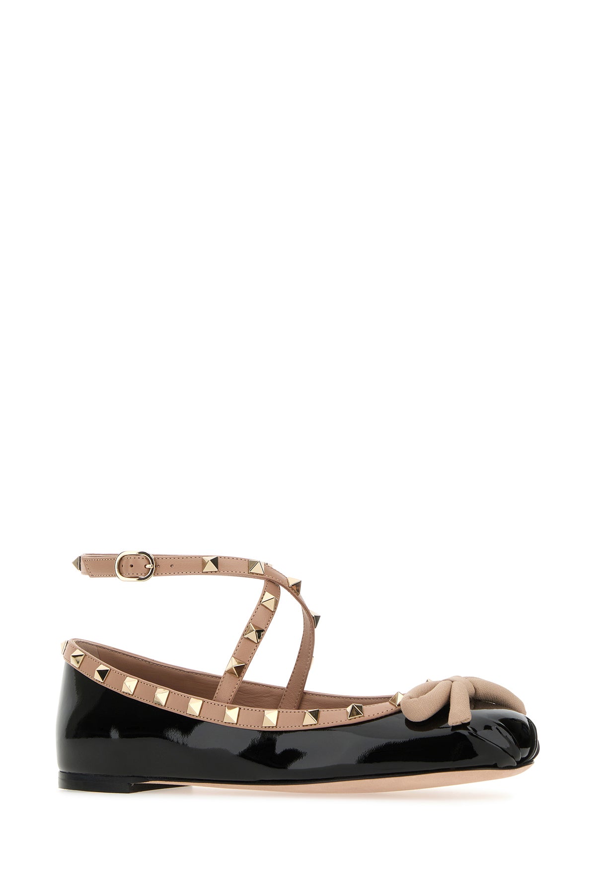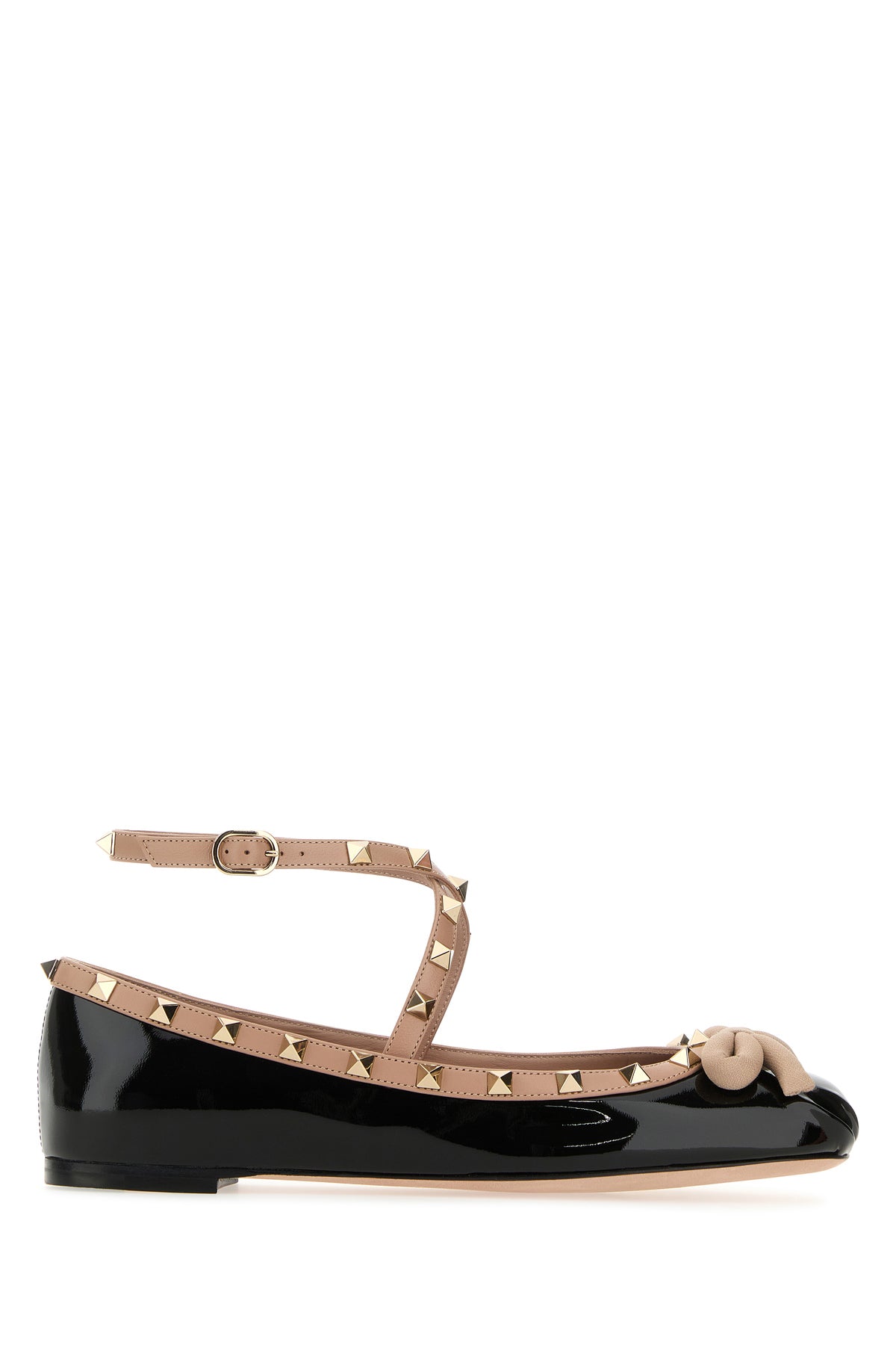 Ballerinas realized in patent leather enriched by contrasting decorative bow at the front and metal studs on the contrasting trimmings.