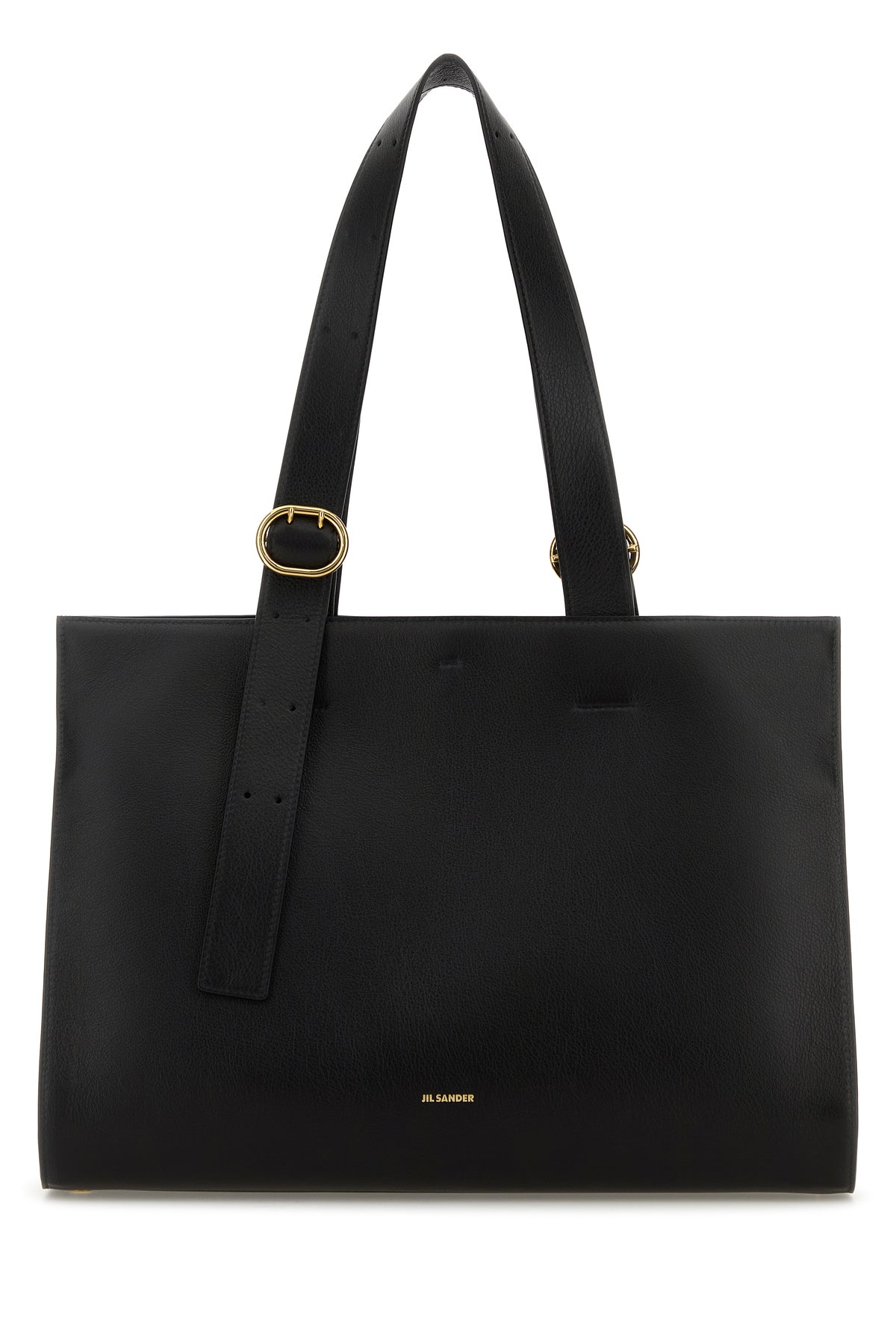 Shopping bag realized in pebble leather characterized by laminated printed logo at the front.