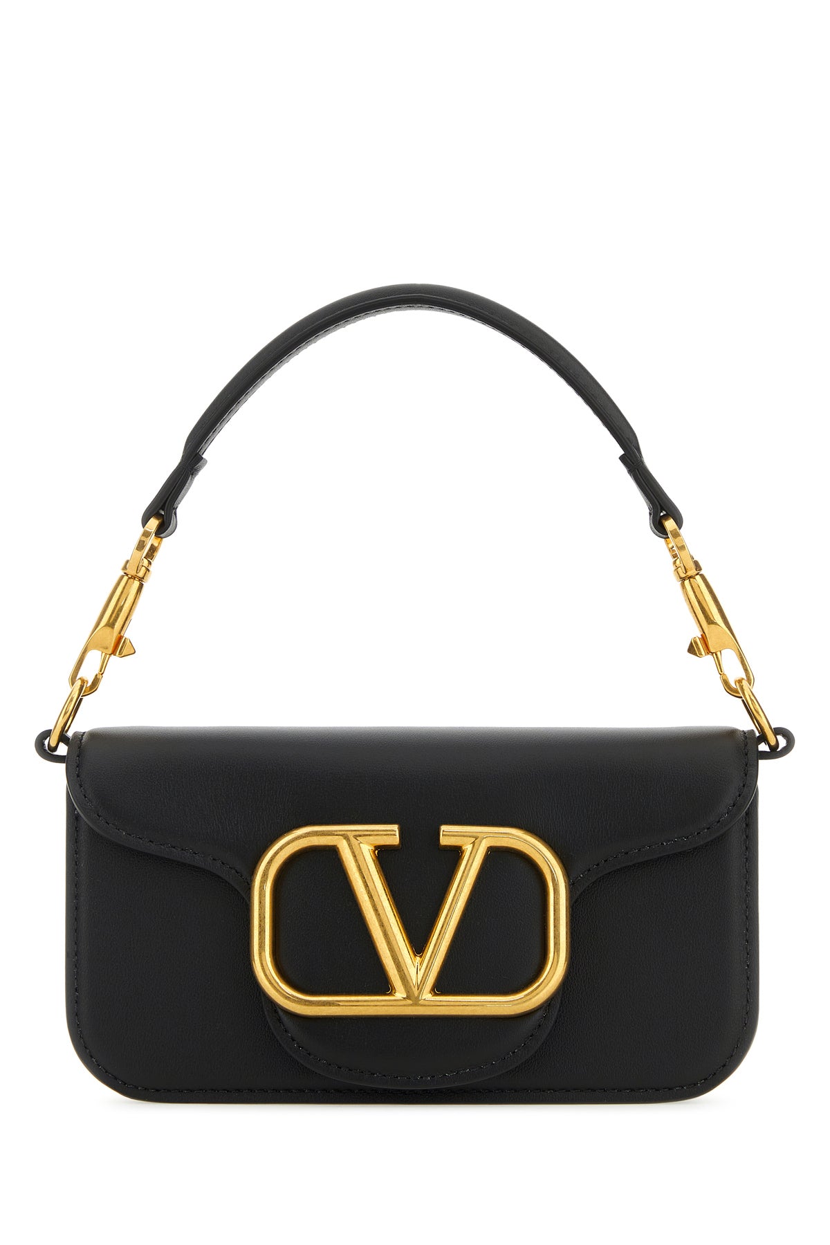 Handbag realized in smooth calf leather characterized by laminated printed logo under the flap enriched by metal VLogo detail with rhinestones at the front.