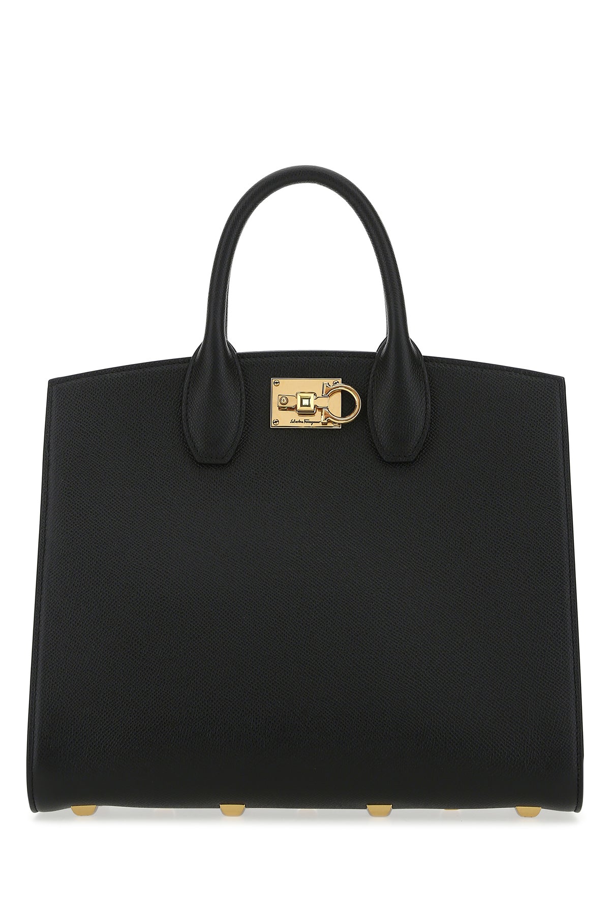 Handbag realized in grained calf leather characterized by snap-fit closure by Gancini detail.
