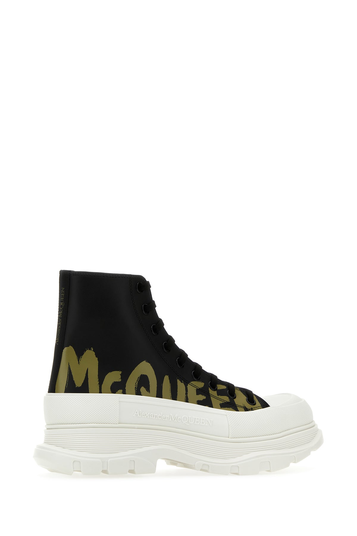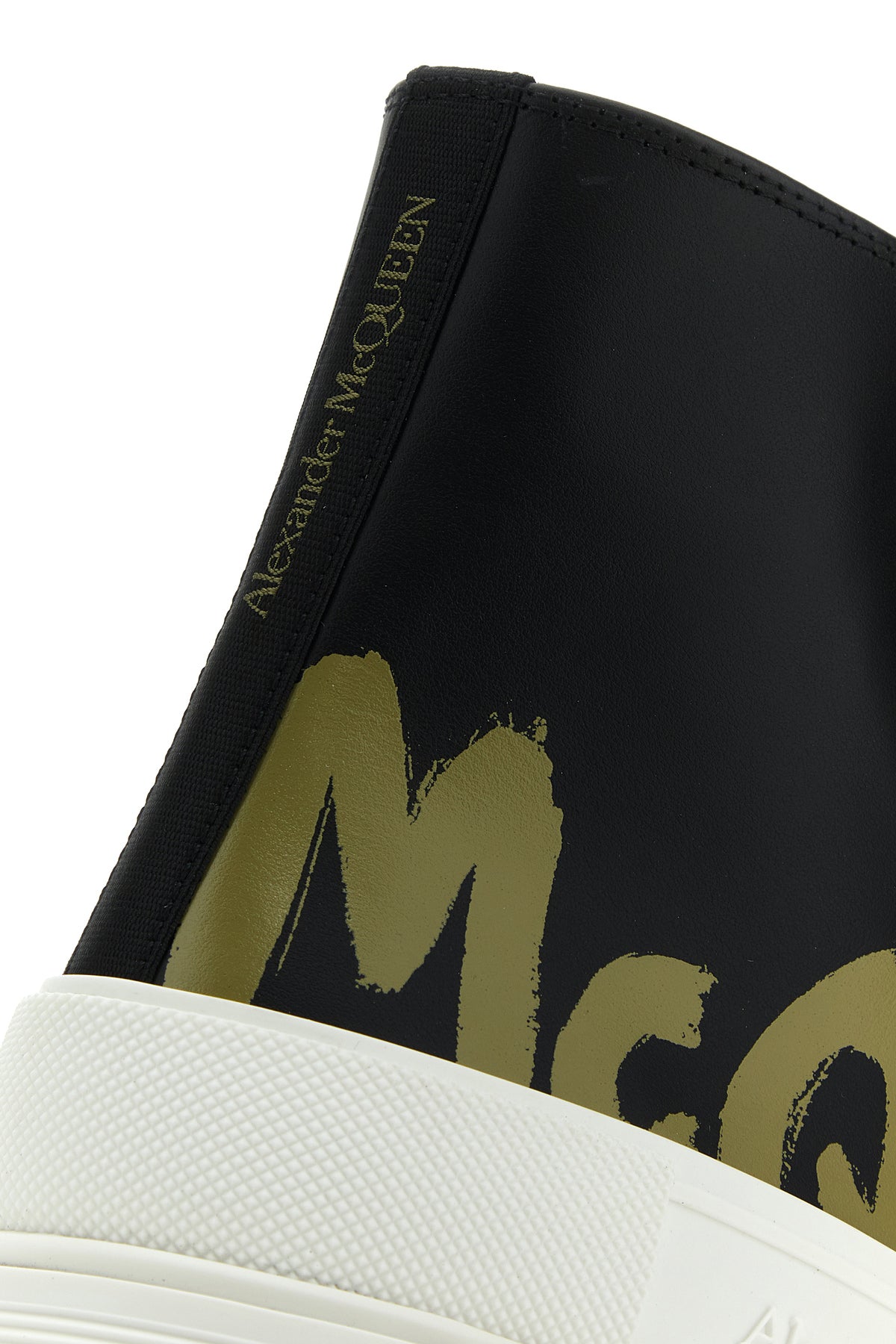 High-top sneakers realized in leather characterized by McQueen Graffiti print on the side, embroidered logo at the back and printed logo in relief on the side.