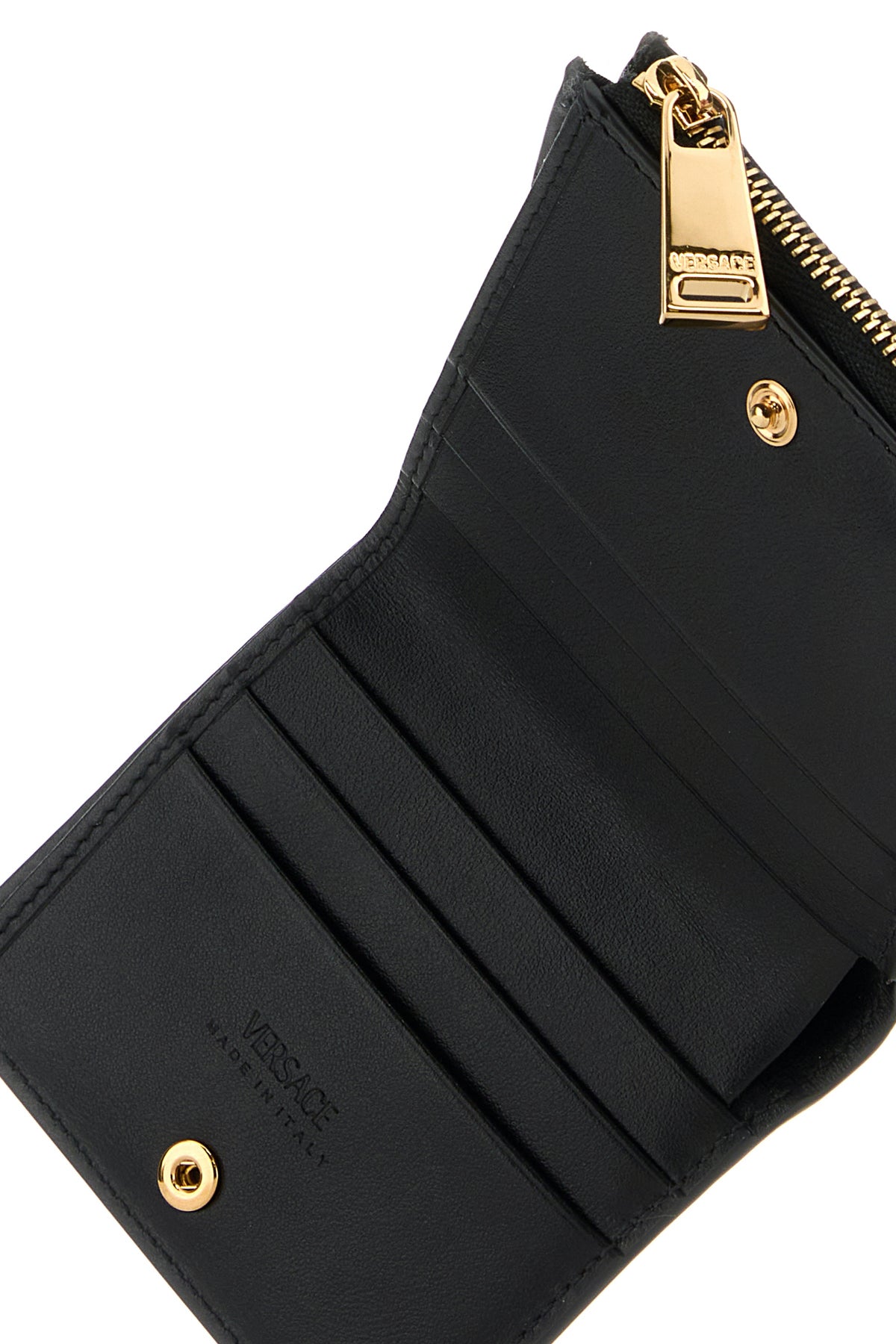 Wallet realized in grained ovine leather characterized by laminated printed logo at the back enriched by Medusa metal detail at the front.