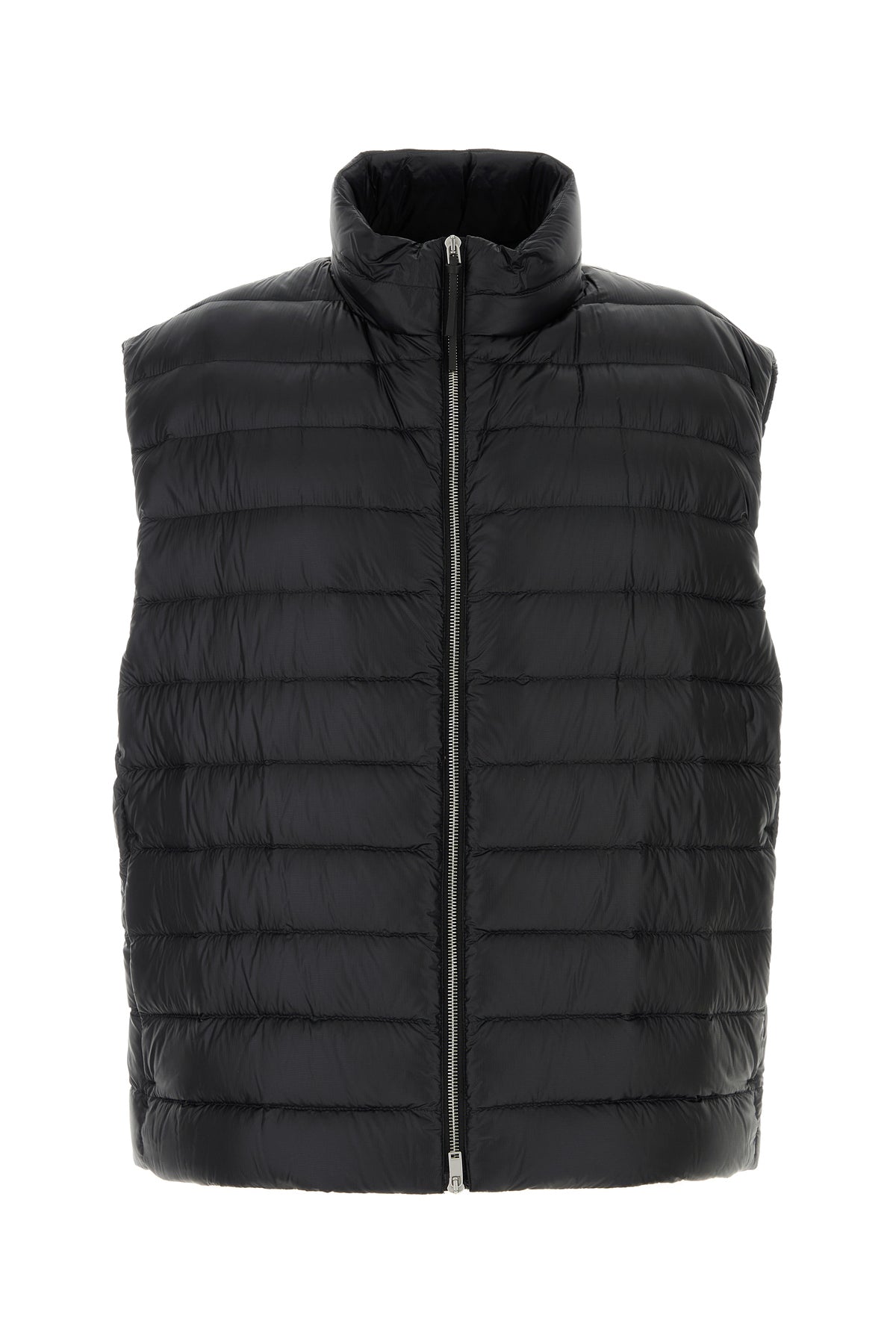 Sleeveless down jacket realized in quilted nylon characterized by high collar.