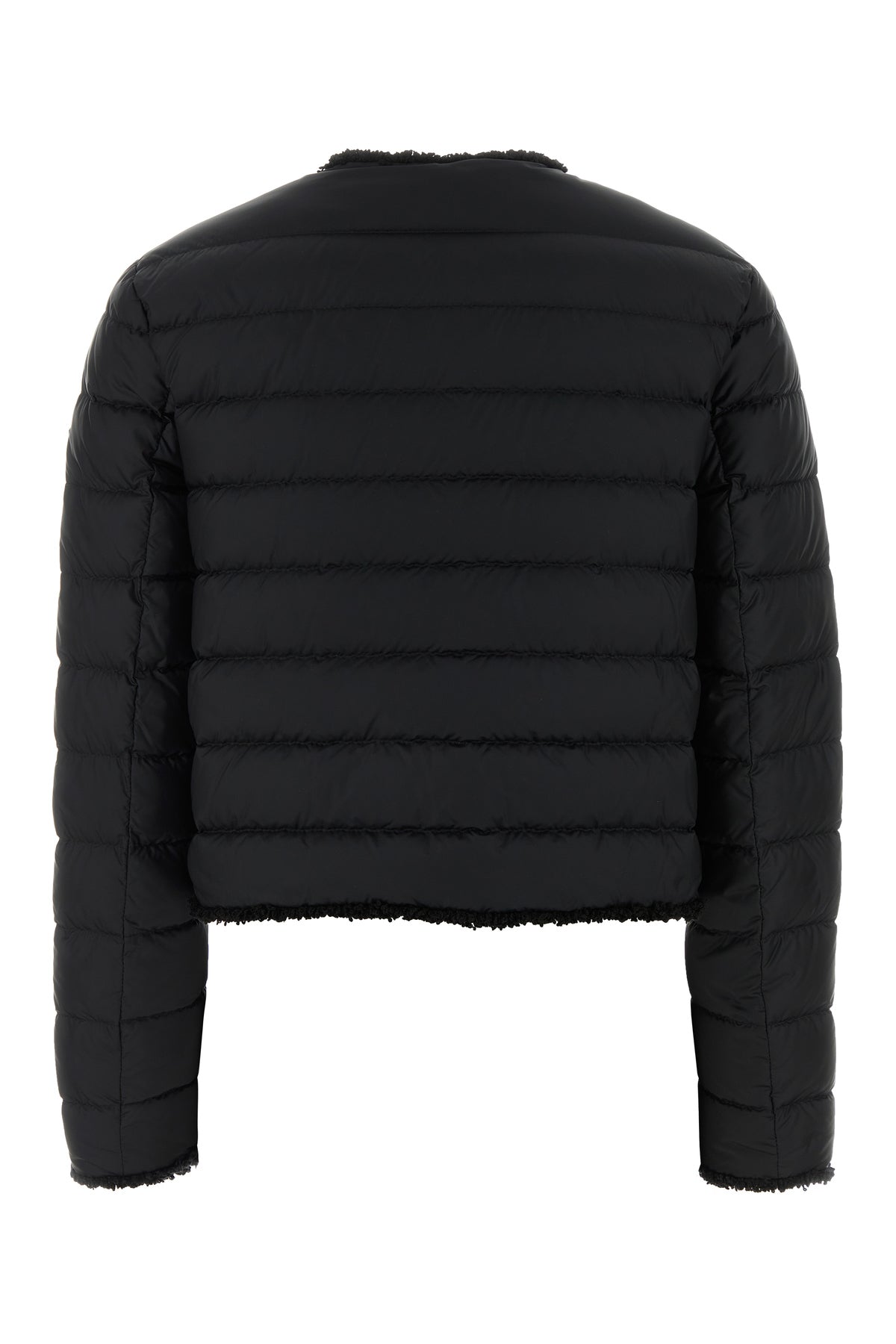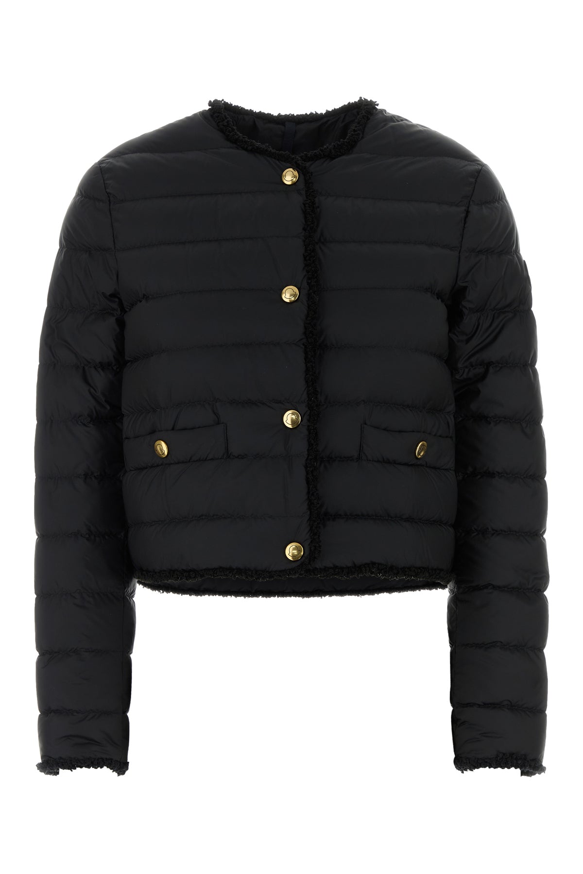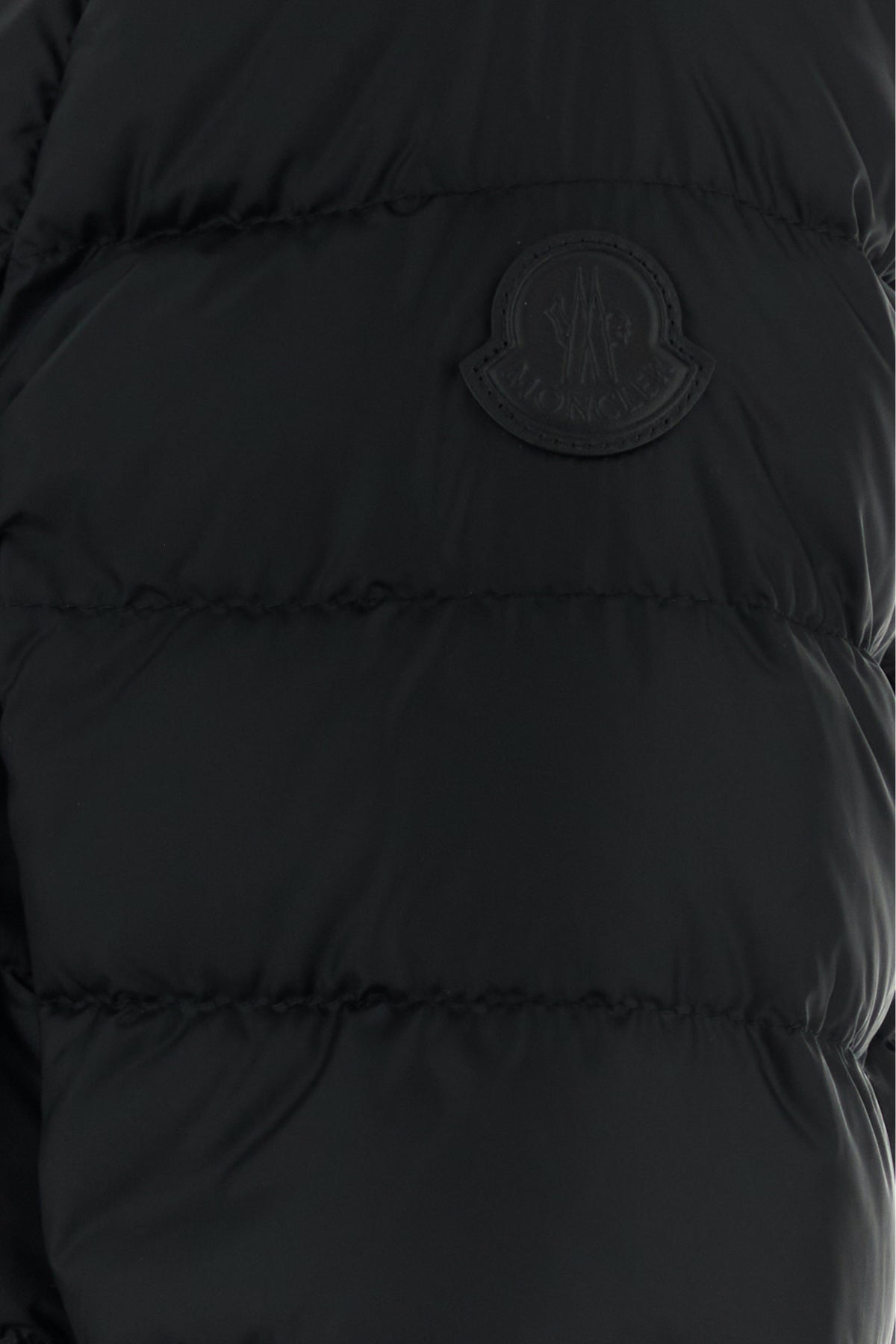 Short-cut down jacket realized in quilted nylon enriched by tonal logoed patch on the sleeve.