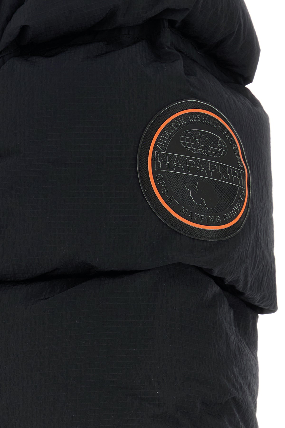 Padded jacket realized in quilted nylon characterized by tonal logo print at the back enriched by logoed patch at the front and on the sleeve.