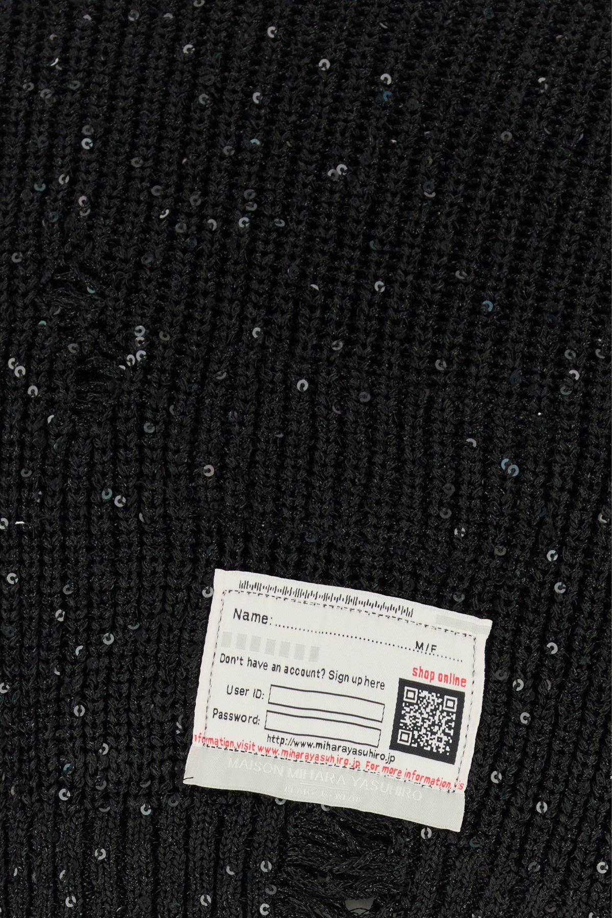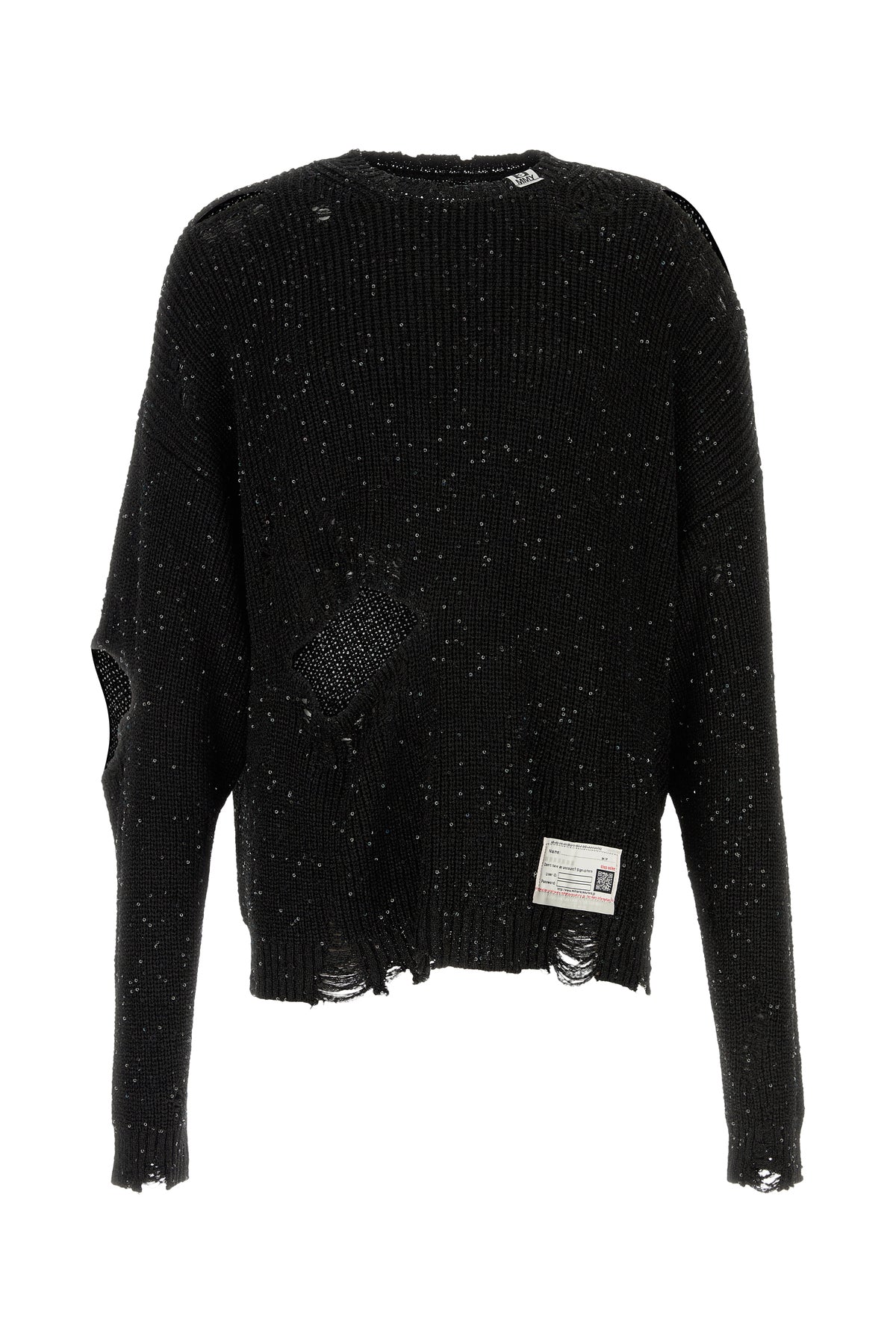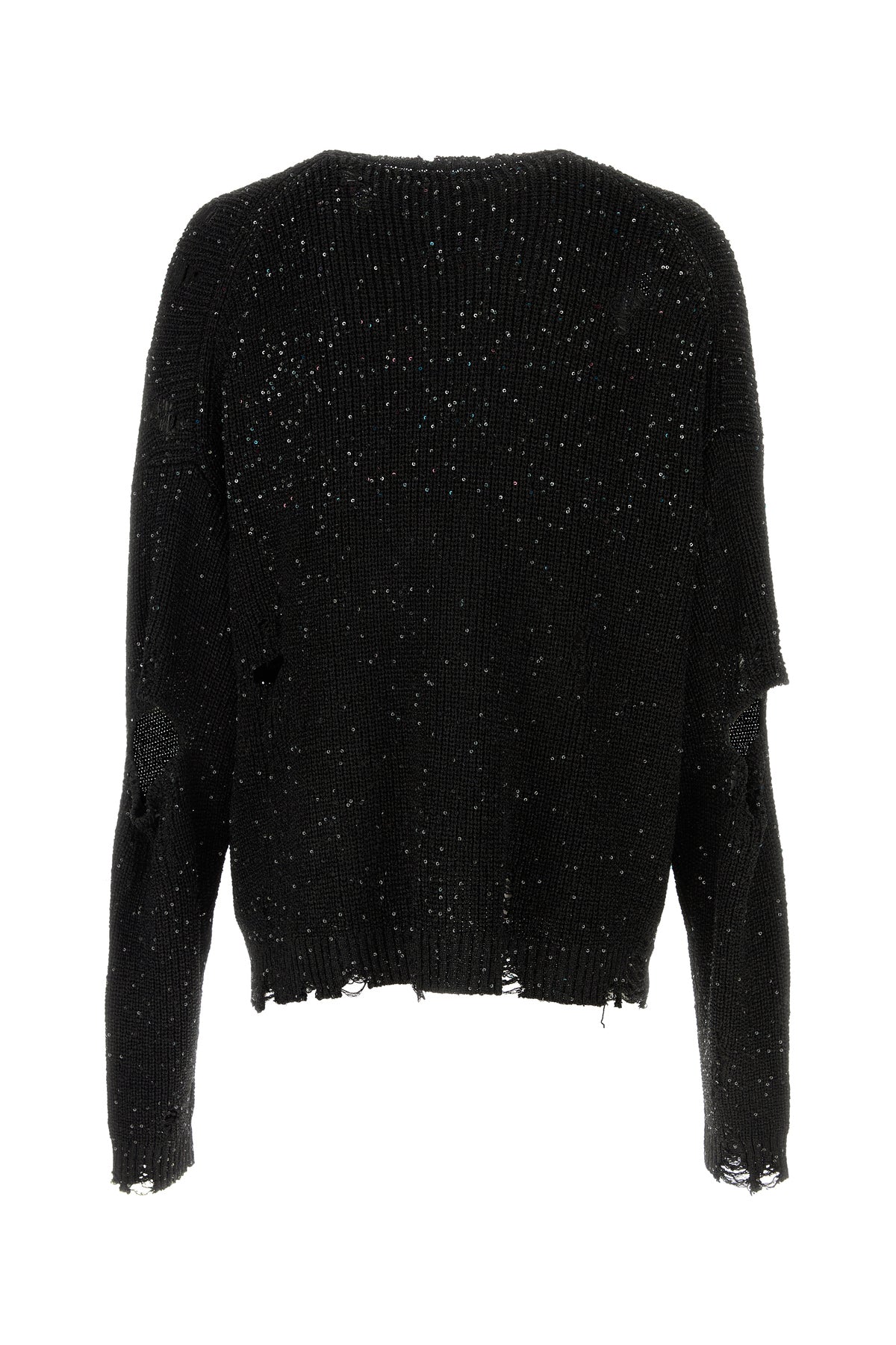 Sweater realized in distressed effect polyester with lurex threads enriched by sequins on the entire surface.
