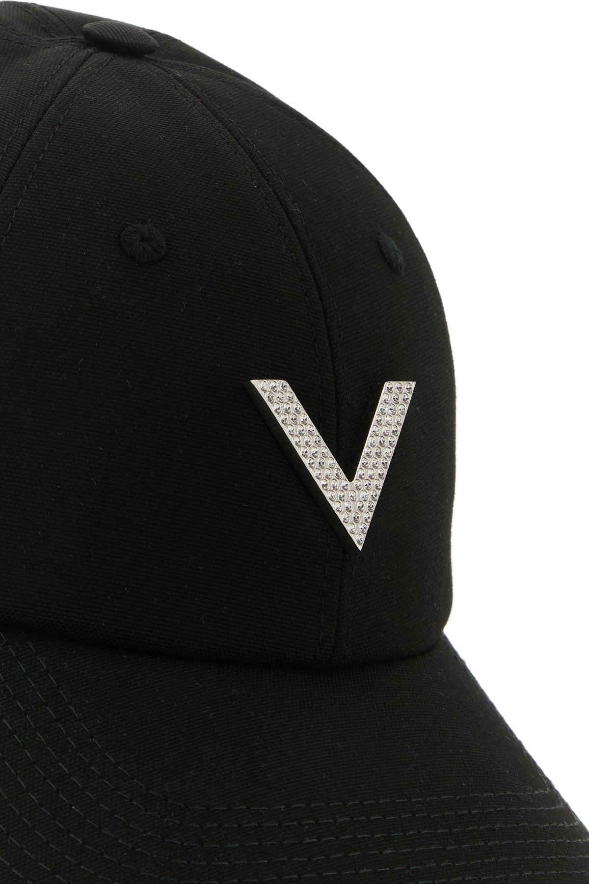 Baseball cap realized in stretch cotton enriched by metal V detail with rhinestones at the front.