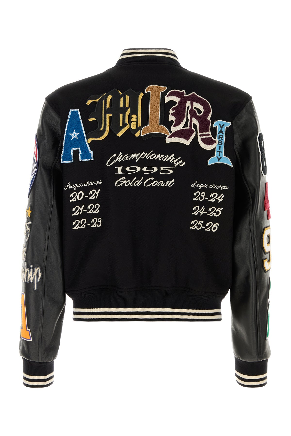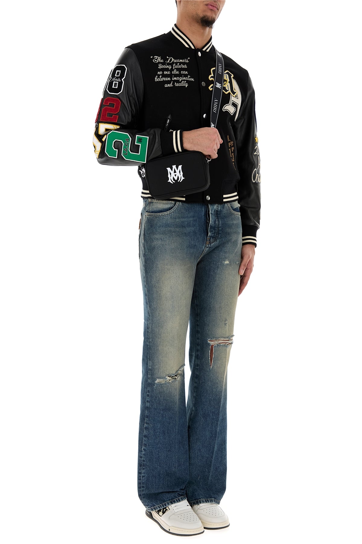 Bomber jacket realized in virgin wool with leather inserts on the sleeves characterized by peculiar embroideries enriched by peculiar patches on the entire surface.