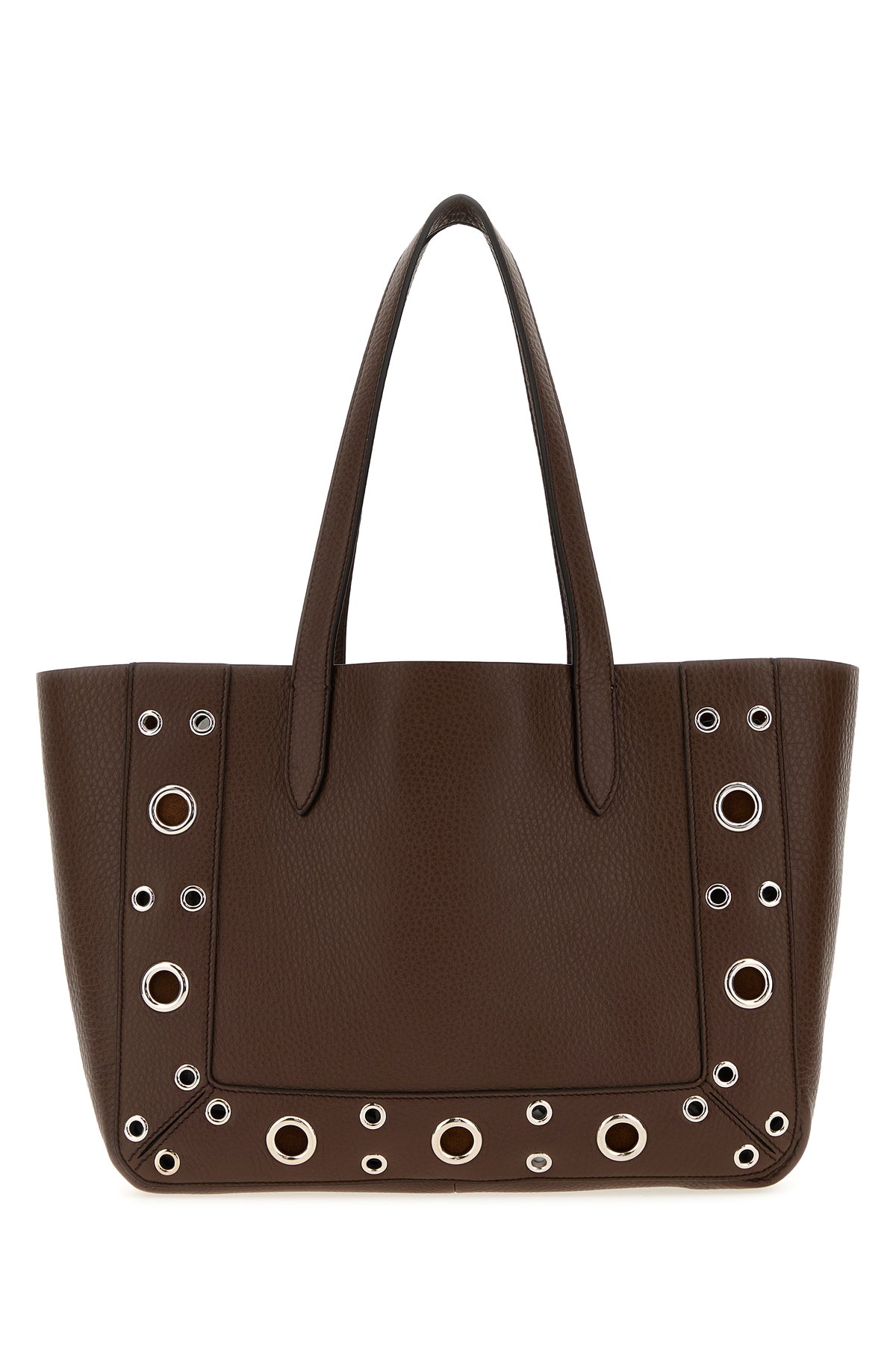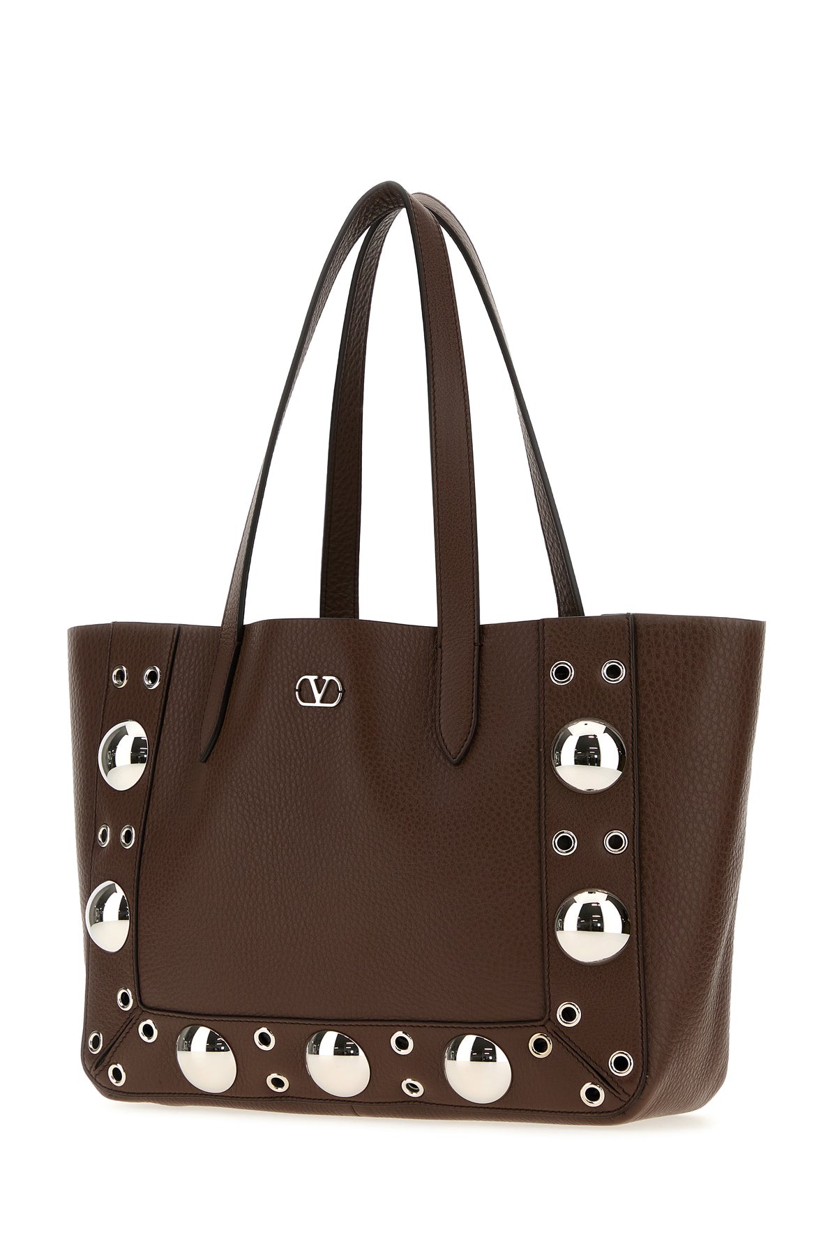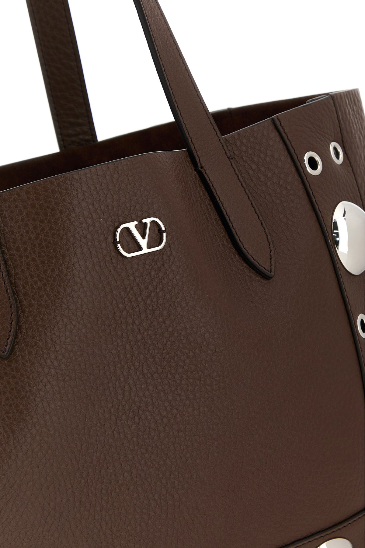 Shopping bag realized in pebble leather enriched by VLogo Signature metal detail at the front and metal studs on the trimmings.