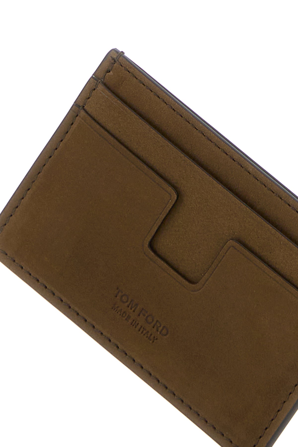 Card holder realized in suede characterized by embossed logo at the front.