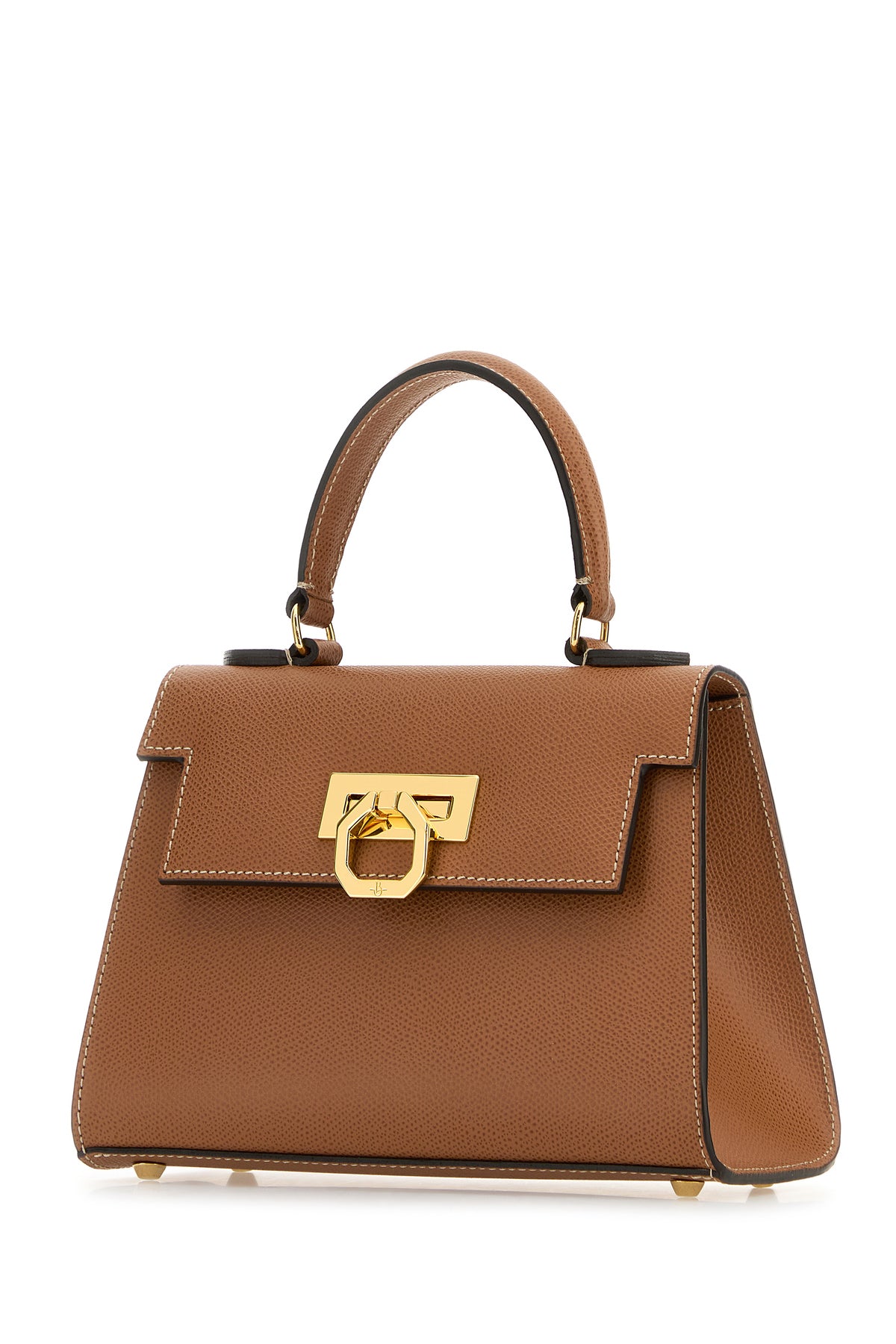 Handbag realized in grained calf leather characterized by snap-fit closure.