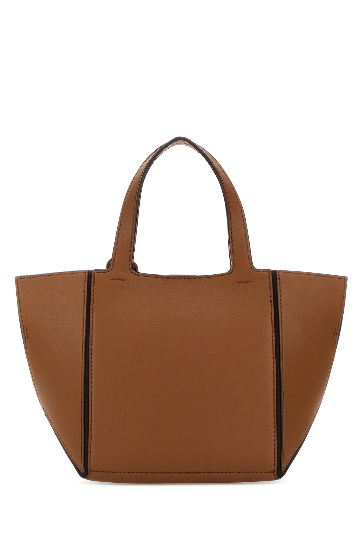 Handbag realized in smooth leather enriched by metal lettering logo at the front.