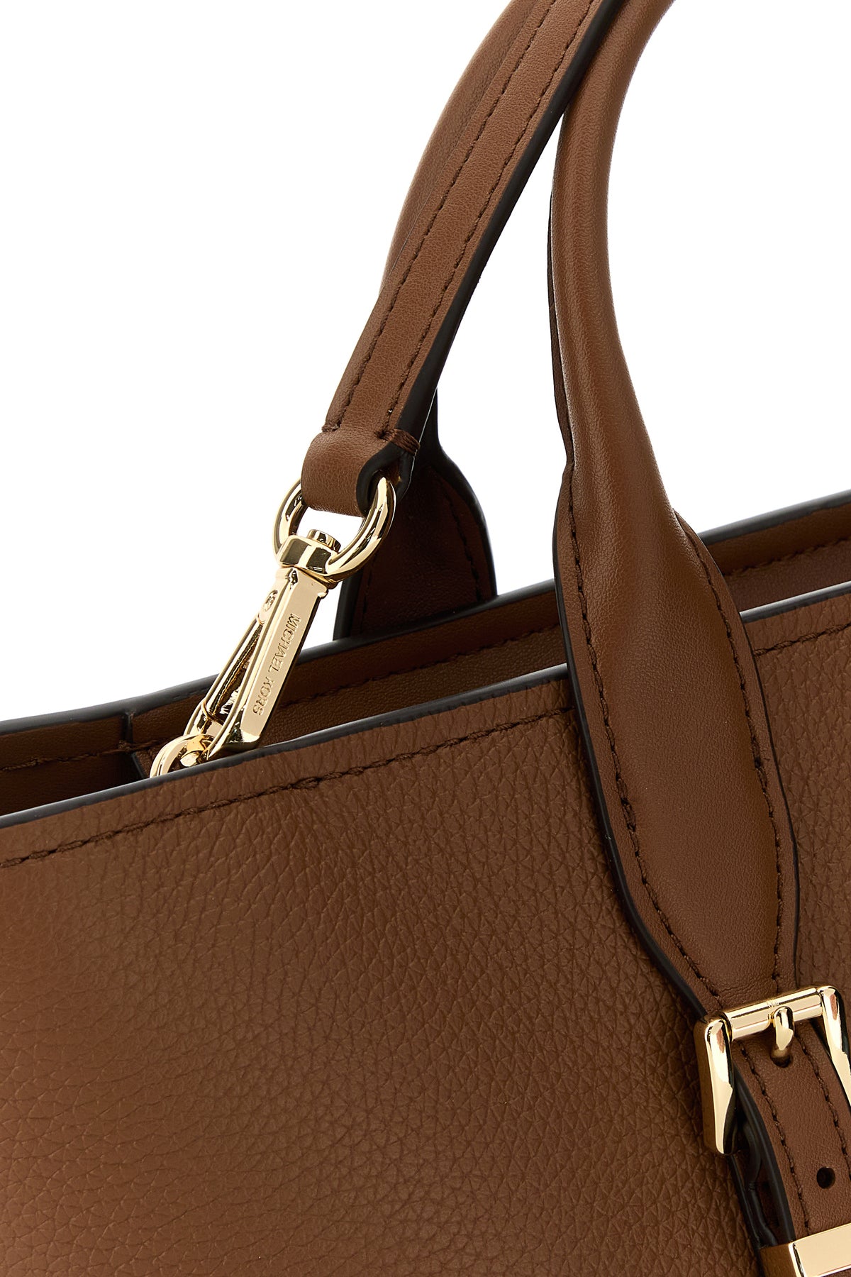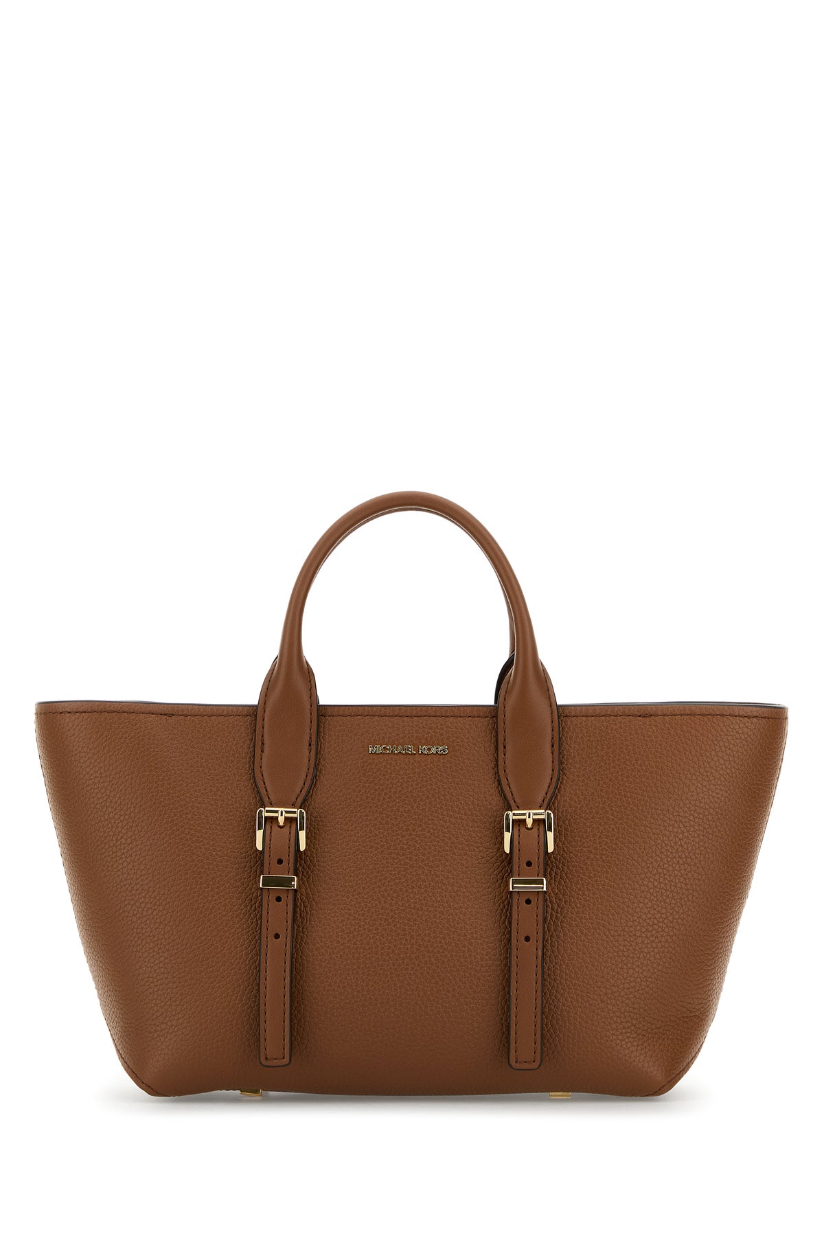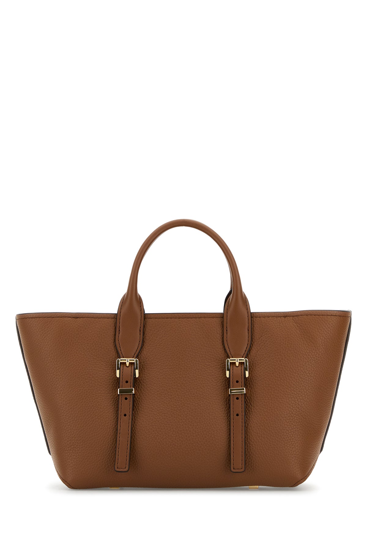 Shopping bag realized in pebble leather enriched by metal lettering logo at the front.