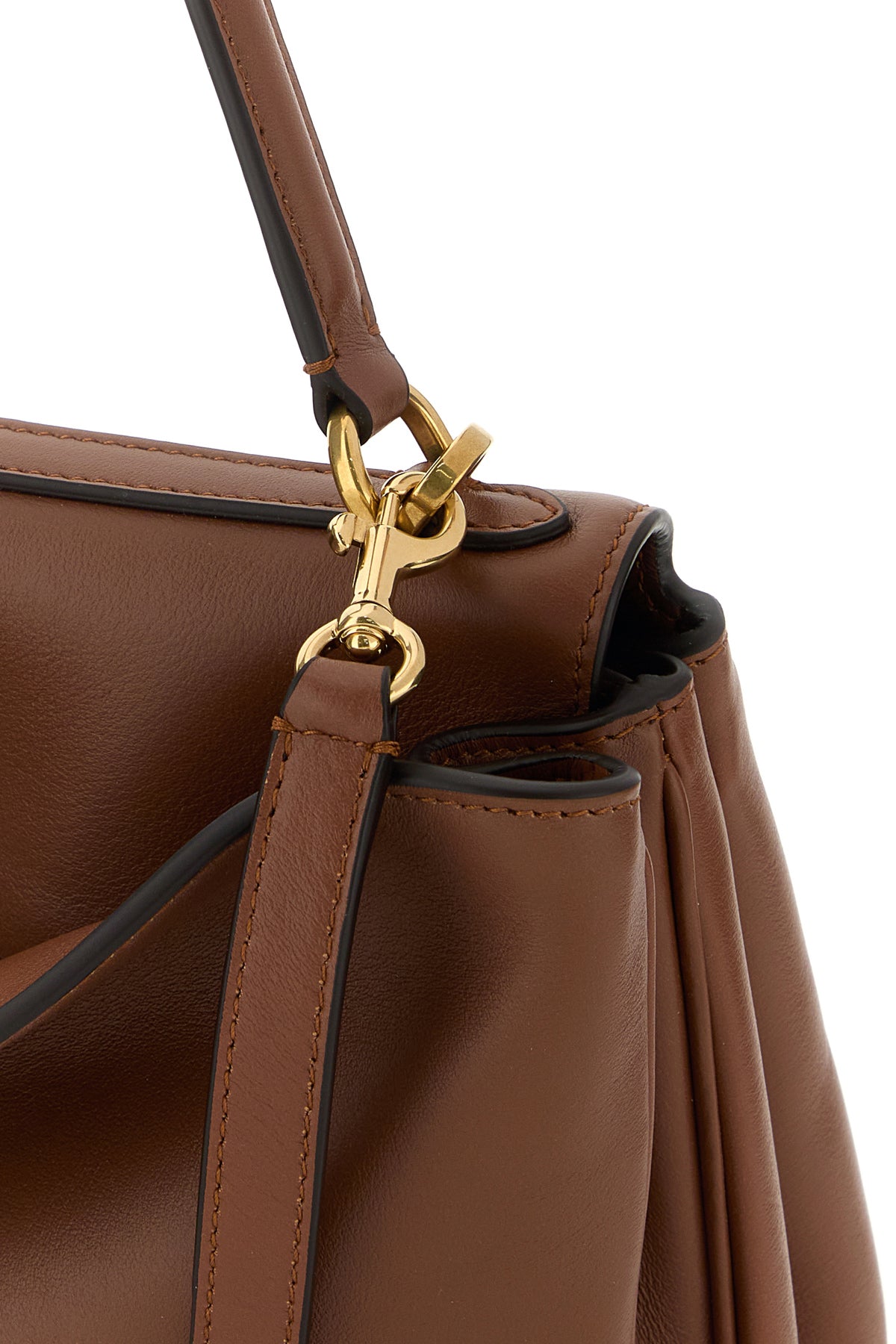 Handbag realized in smooth calf leather enriched by detachable tonal leather accessory with metal rings.