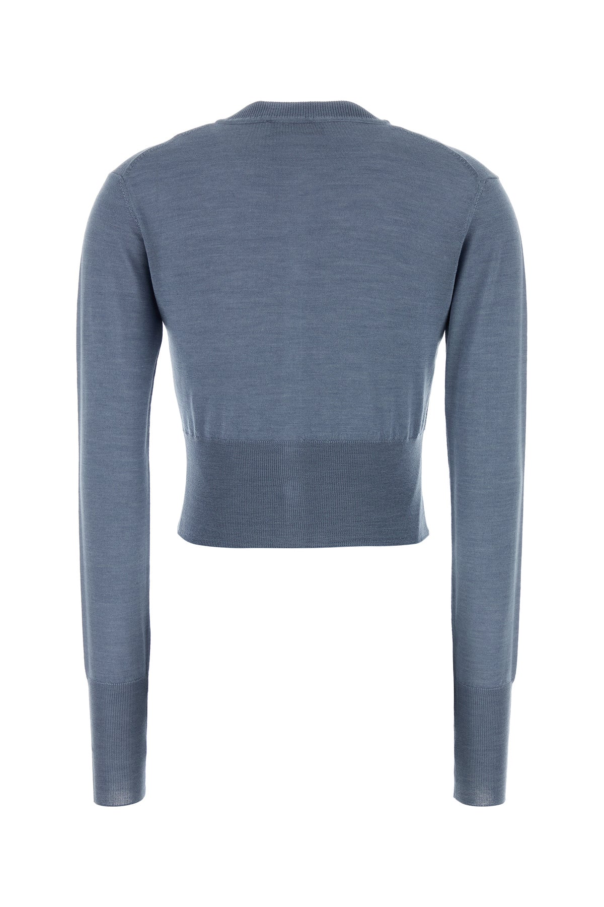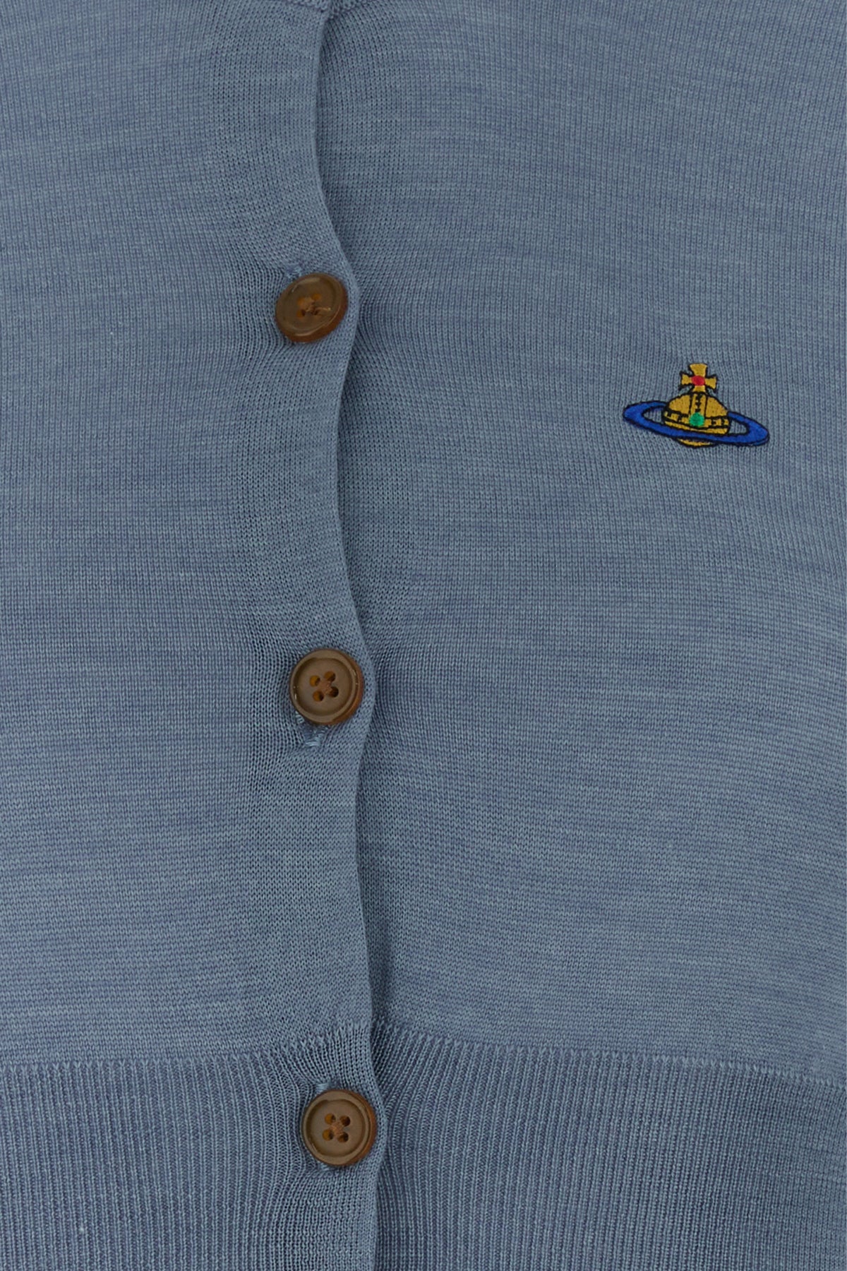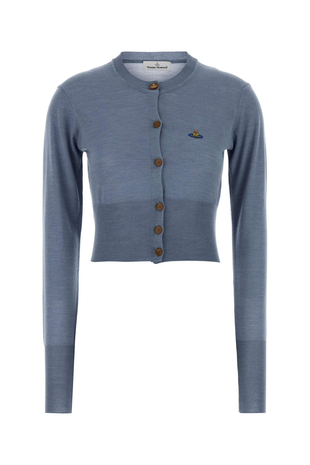 Cropped-cut cardigan realized in pure merino wool characterized by contrasting Orb embroidery on the chest.