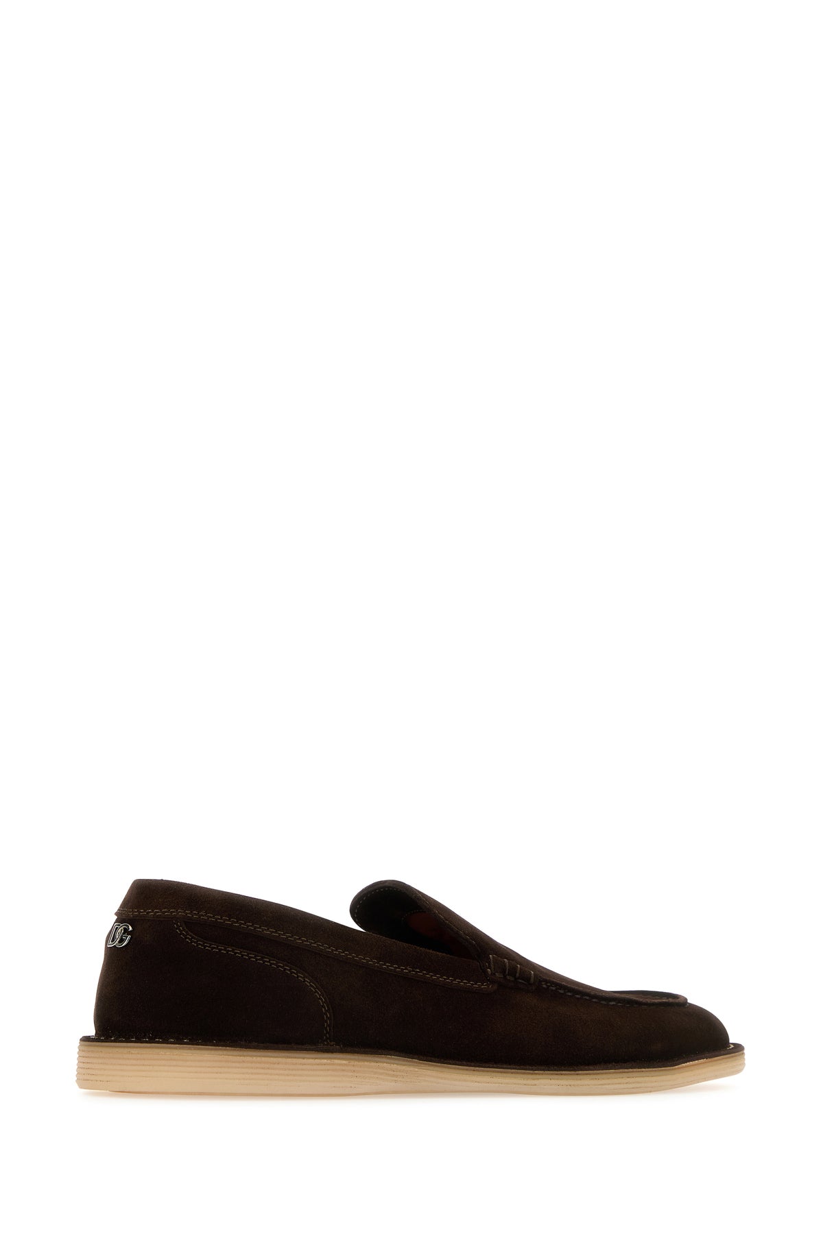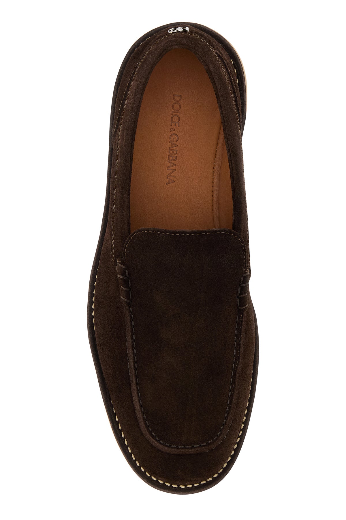 Loafers realized in calf suede enriched by metal DG detail on the heel.