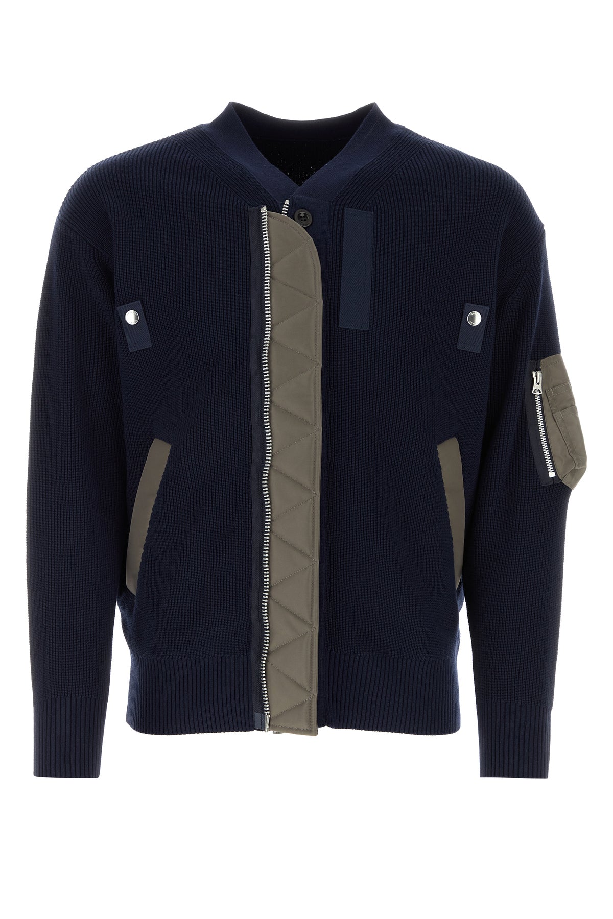 Cardigan realized in ribbed cotton blend with contrasting nylon inserts at the front.