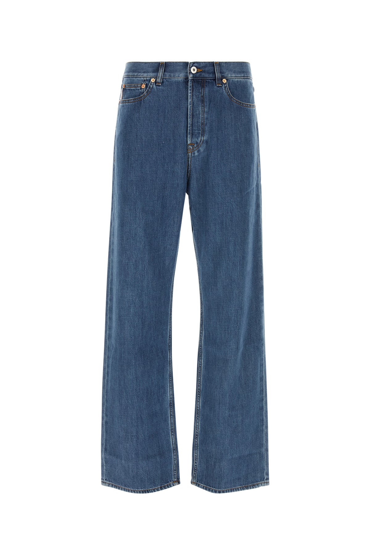 Regular jeans realized in denim enriched by contrasting logoed label at the back.