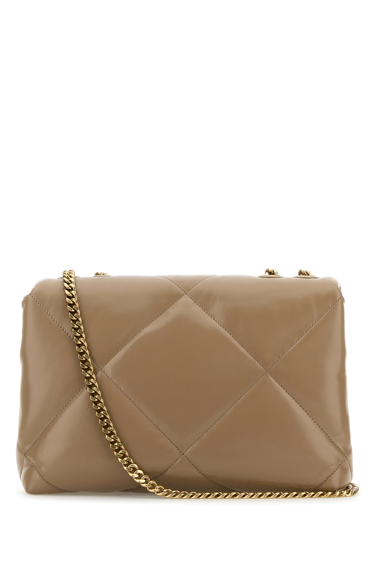 Shoulder bag realized in quilted leather enriched by metal logoed detail at the front.